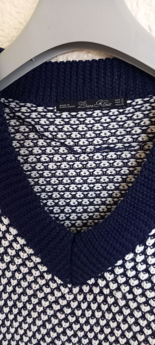 Pull col V Zara knit bleu marine et blanc, noté taille S mais convient aussi à 38/40