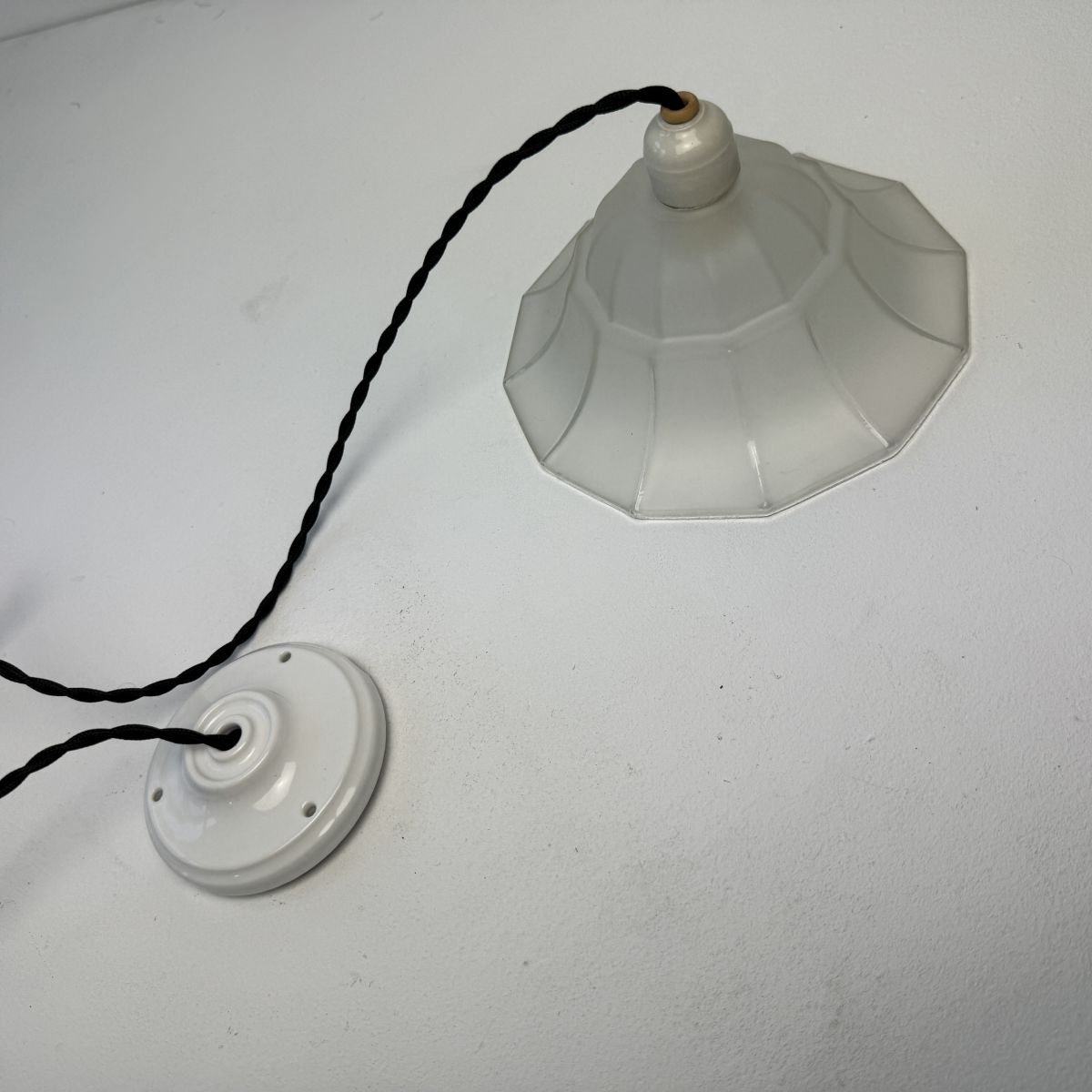 Douille à baïonnette en céramique (ampoule B22), rosace de fixation en porcelaine. Fil tressé en tissu noir, prête à installer. Branchement par domino.