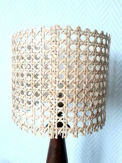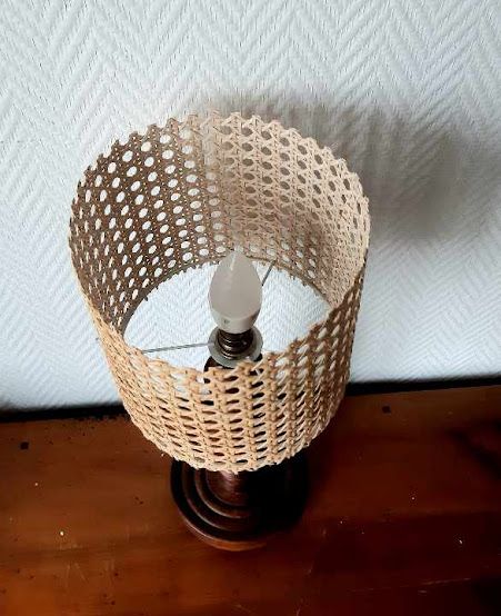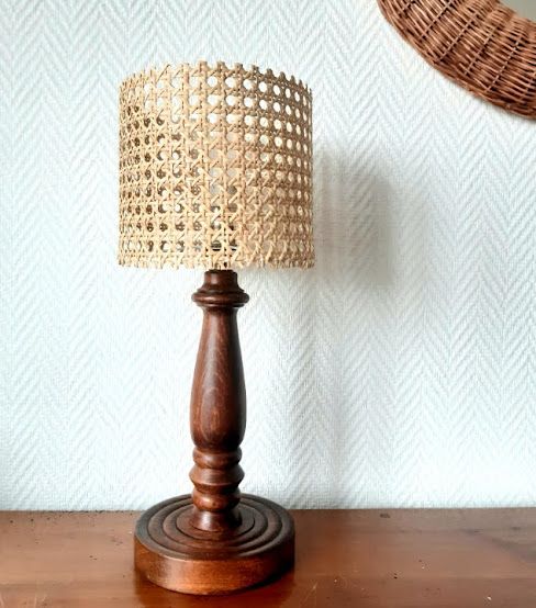 Pied de lampe à base cylindrique avec travail art déco sur le pied. Abat jour en cannage. Electrification propre et fonctionnelle : douille à baïonnettes, bouton d'allumage et prise en bakélite noir.