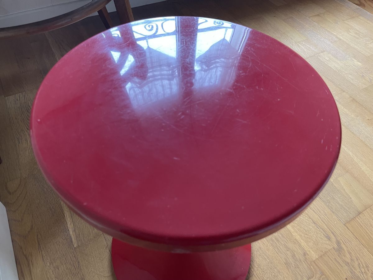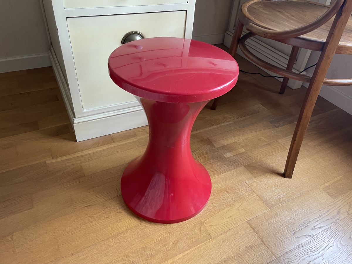 Tabouret Tam Tam de couleur rouge, original des années 70, réf 169 manufacturé par la STAMP à Nurieux(01), estampillé, hauteur 45cm, diamètre assise 30cm, quelques traces d’usage (voir photos), bon état général.