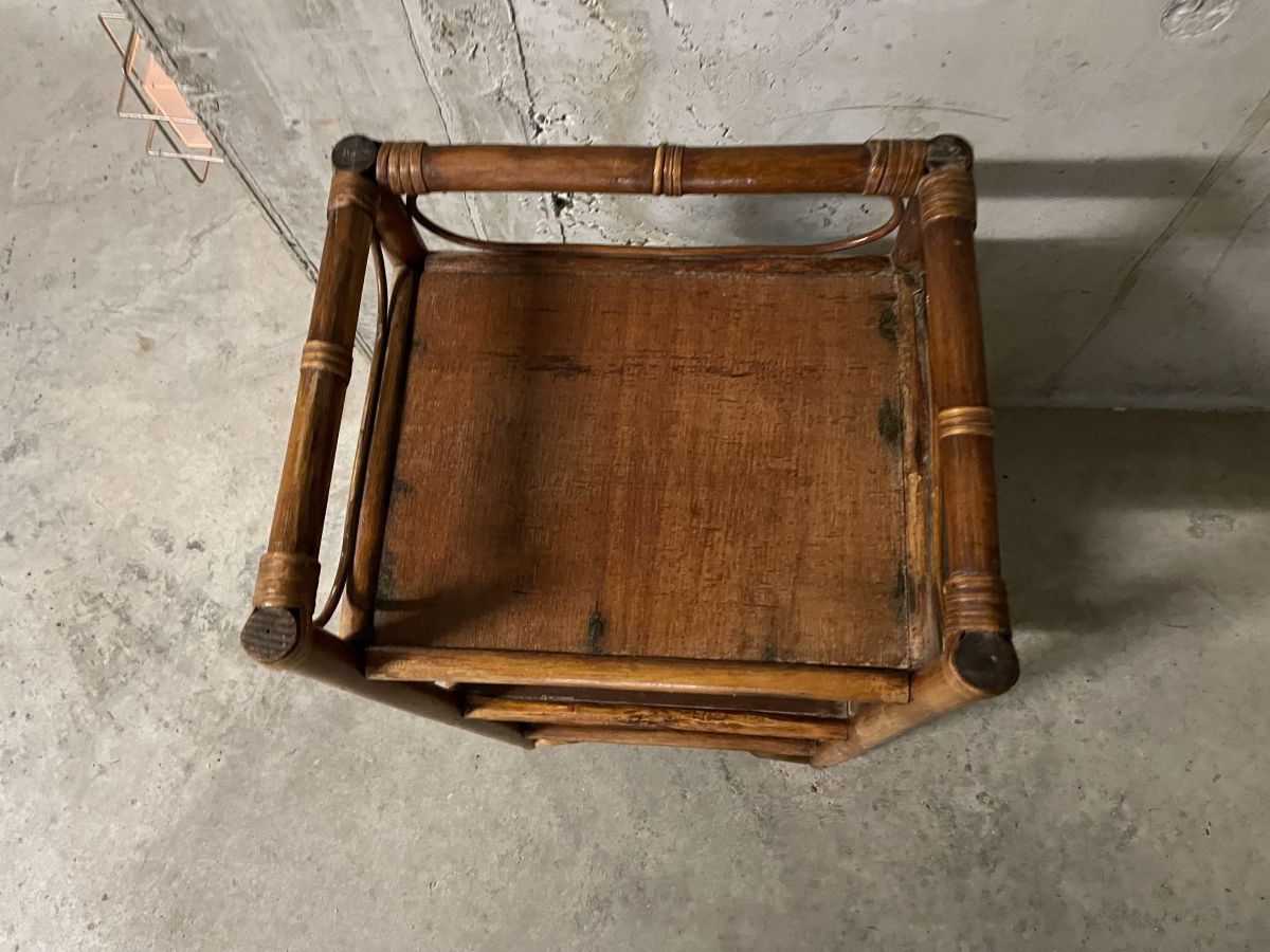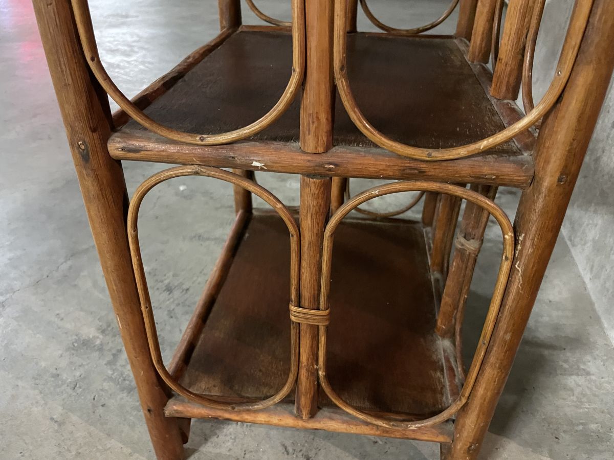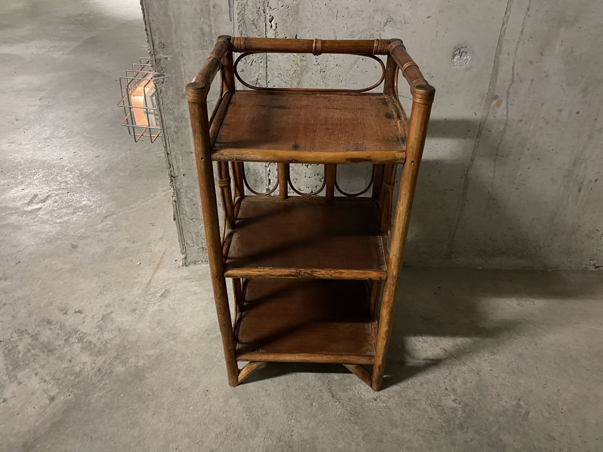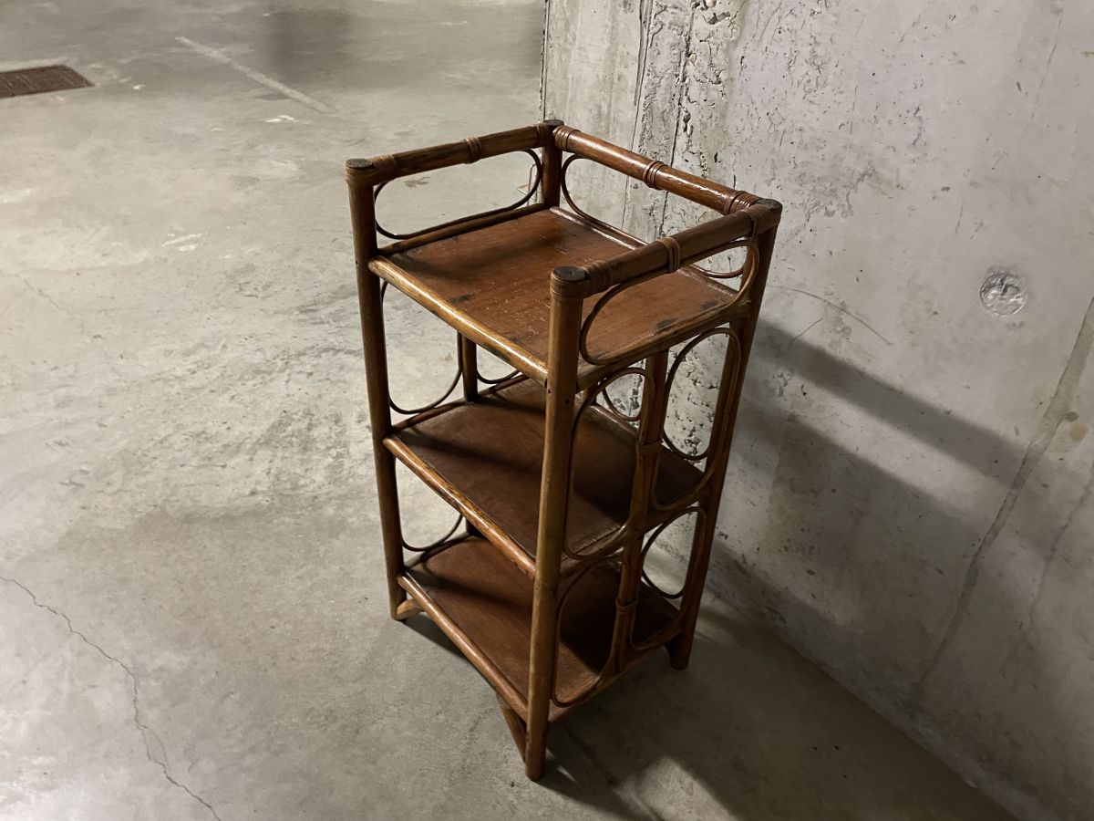 Petite étagère en rotin des années 60, belle patine, légères traces d’usage, entièrement passée au rénovateur de bois, dimensions (cm) : L.35xH.68xP.30, bon état.