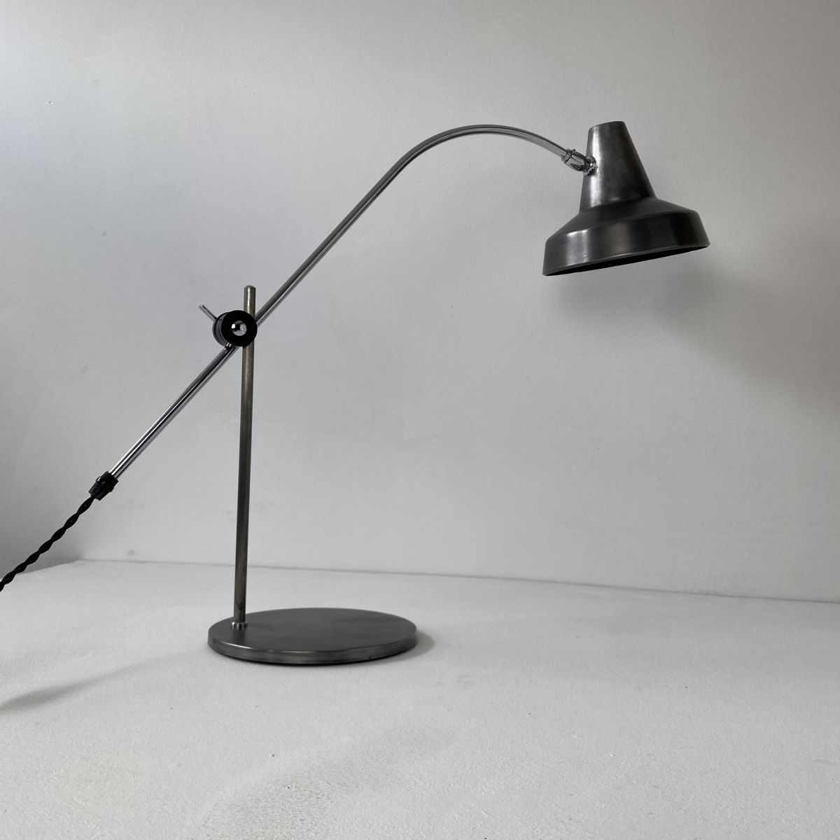 Belle lampe des années 1970 avec bras articulé. Tout acier sauf la fixation du bras en plastique dur. Le réflecteur s’oriente légèrement grâce à sa rotule. Belle ampleur du bras courbé. Le bras s’articule en tous sens et monte et baisse sur l’axe central.