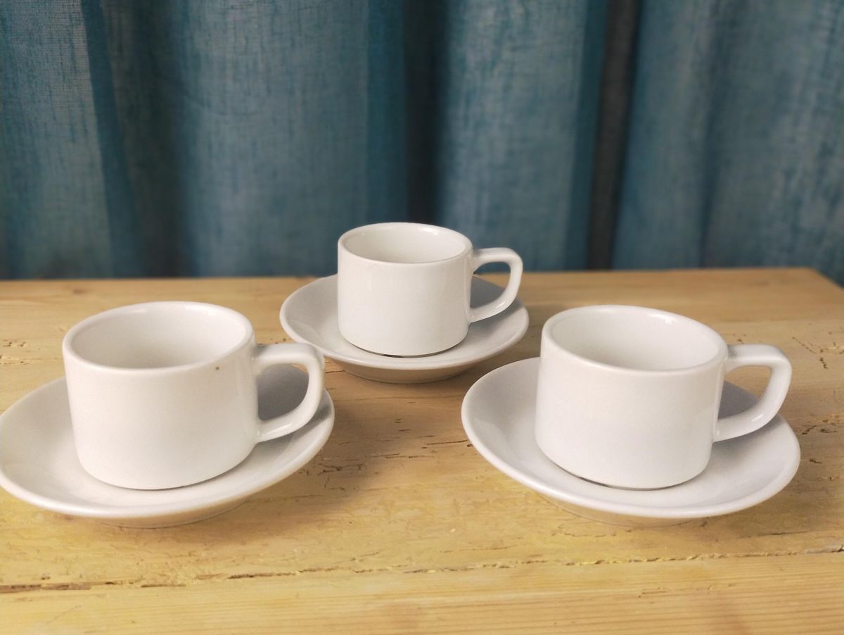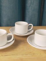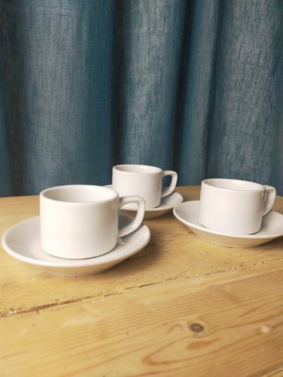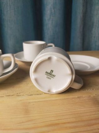 Schonwald est une marque allemande de porcelaine hotellière. De renommée internationale, cette fabrique exporte ses productions dans des dizaines de pays pour des établissements gastronomiques de grande renommée. Il s'agit d'une porcelaine robuste et résistante aux chocs. Ce set montre quelques traces de son usage. Une histoire à se raconter au moment du café.