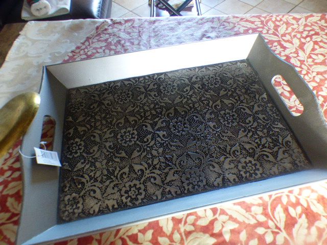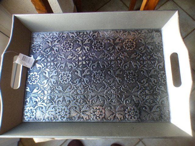 daté de 1980 mais Neuf, plateau de service tour et fond en bois gris recouvert d'une fine épaisseur de métal Couleur argenté.