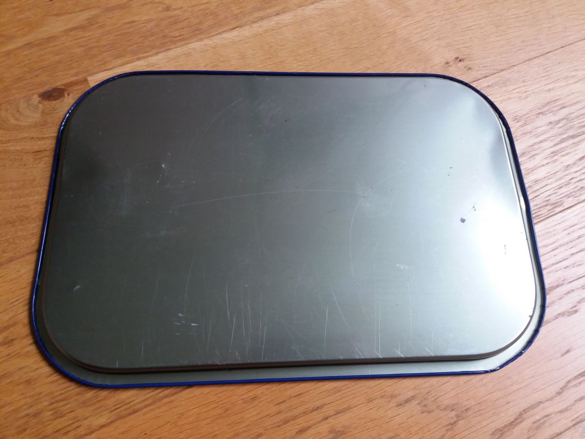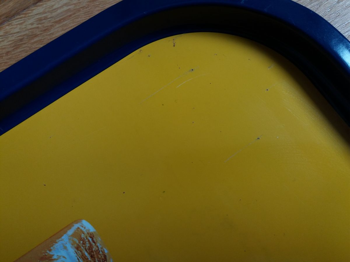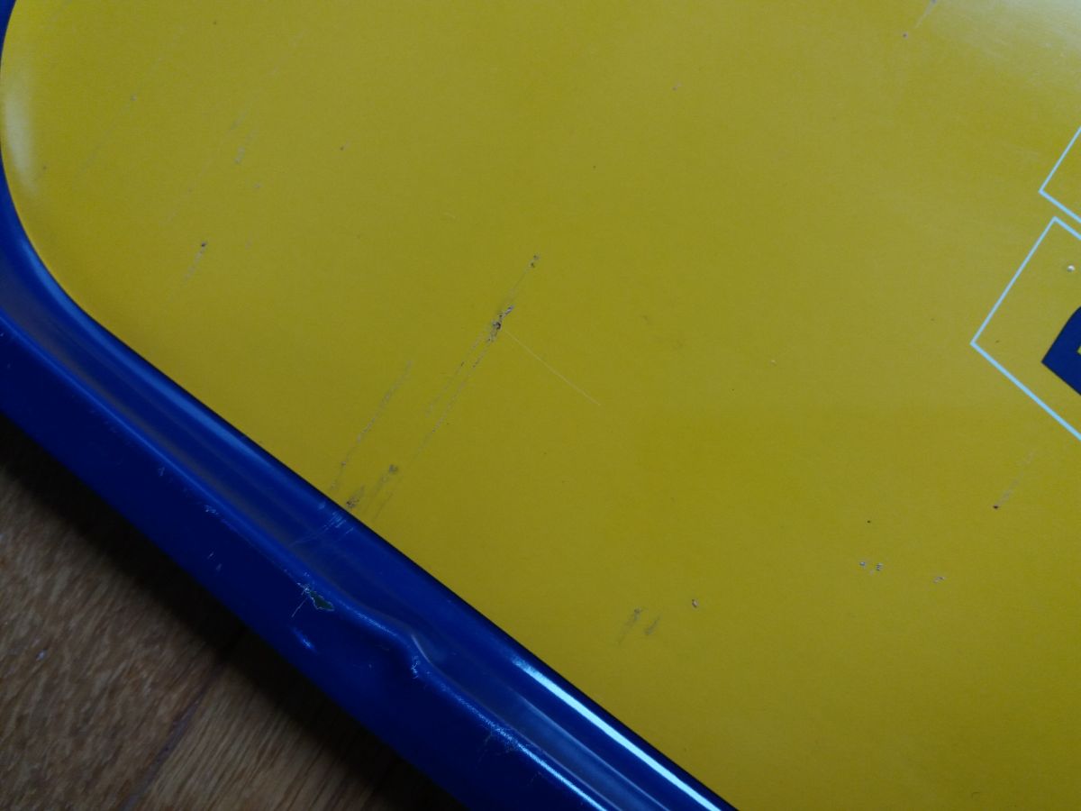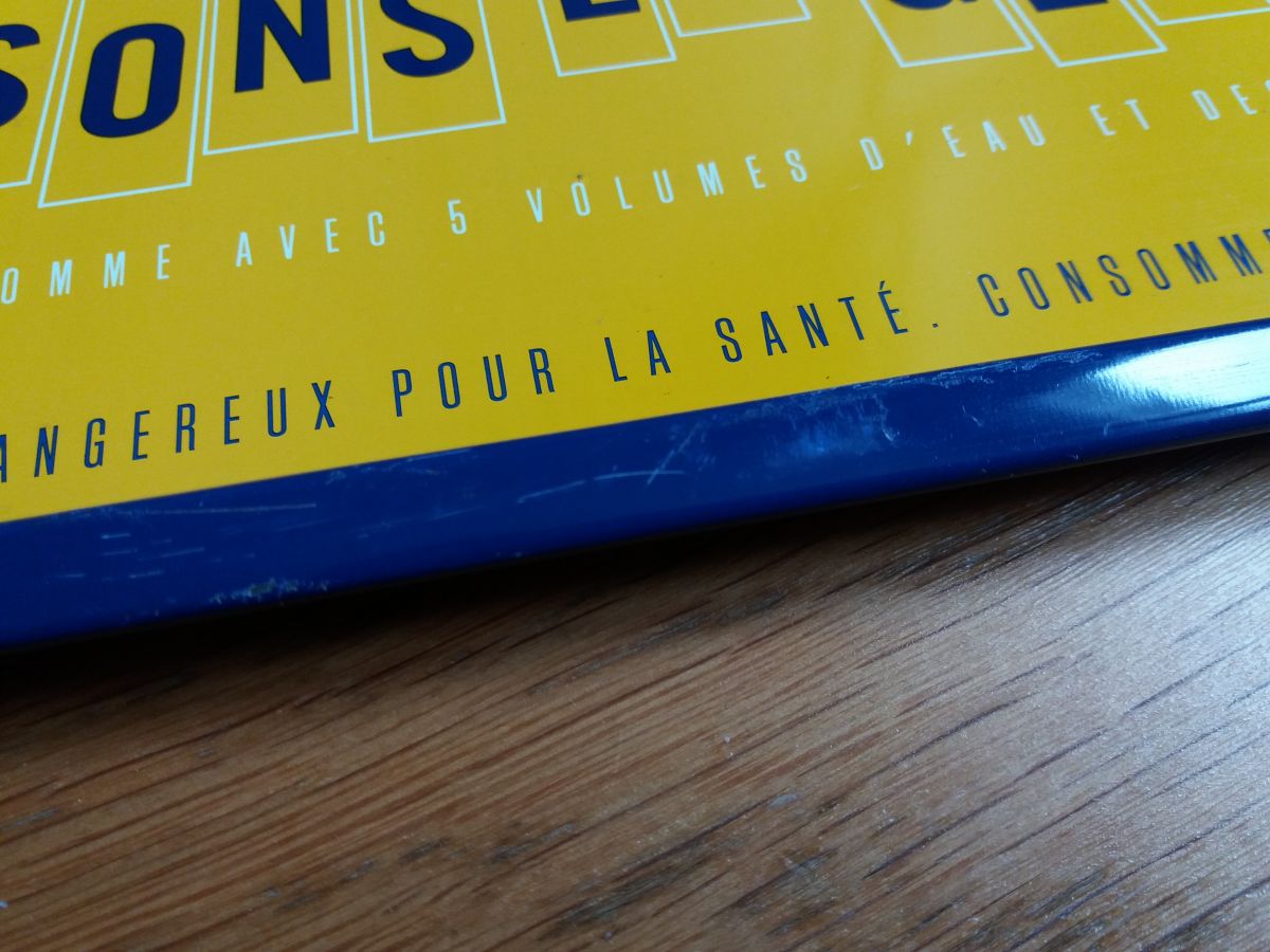 Joli et collector, ce plateau à l’effigie de la célèbre marque d’apéritif ravira les collectionneurs comme les amateurs de vintage, idéal pour servir l’apéro sur la terrasse ! Il est en métal laqué aux couleurs de la marque (la couleur jaune est légèrement différente par rapport au rendu sur les photos, elle tire très légèrement plus sur l’orangé). J’ai essayé de le dater précisément mais n’ai pas trouvé d’infos très précises, si vous en avez, cela m’intéresse. Le plateau est fonctionnel, en bon état général mais ne cache pas quelques traces d’usage : quelques enfoncements dont le plus important sur le bord du plateau, côté gauche. Quelques marques diverses sur la peinture : rayures, petites taches et petits manques de peinture, quelques points de corrosion et rayures en face arrière. Il mesure 39 cm par 26 cm pour une épaisseur de 1,2 cm.