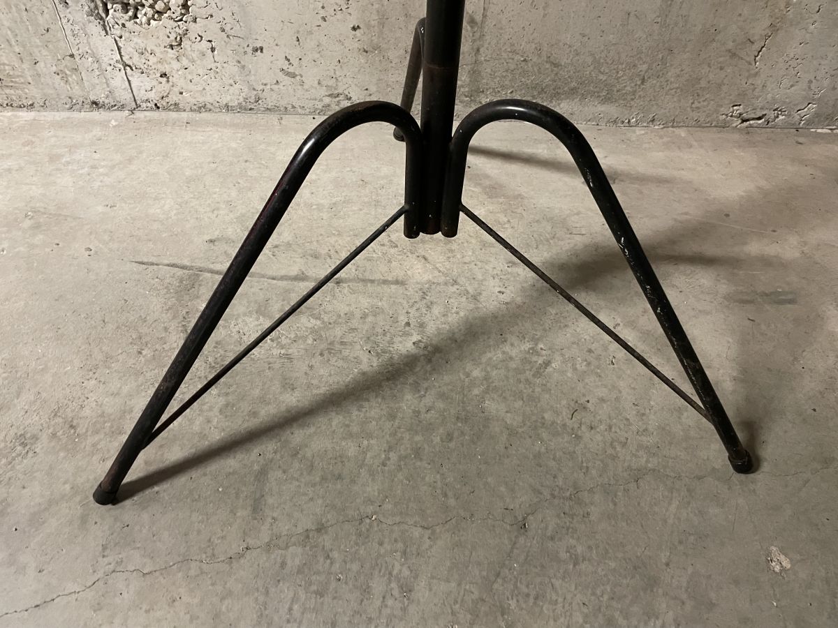 Portemanteau avec boules de couleur des années 50, métal noir et boules en bois rouge, vert et jaune, traces d’usage, hauteur 175cm, diamètre piétement 68cm, dimensions pour envoi (cm) : L.110xH.50xP.70, bon état.