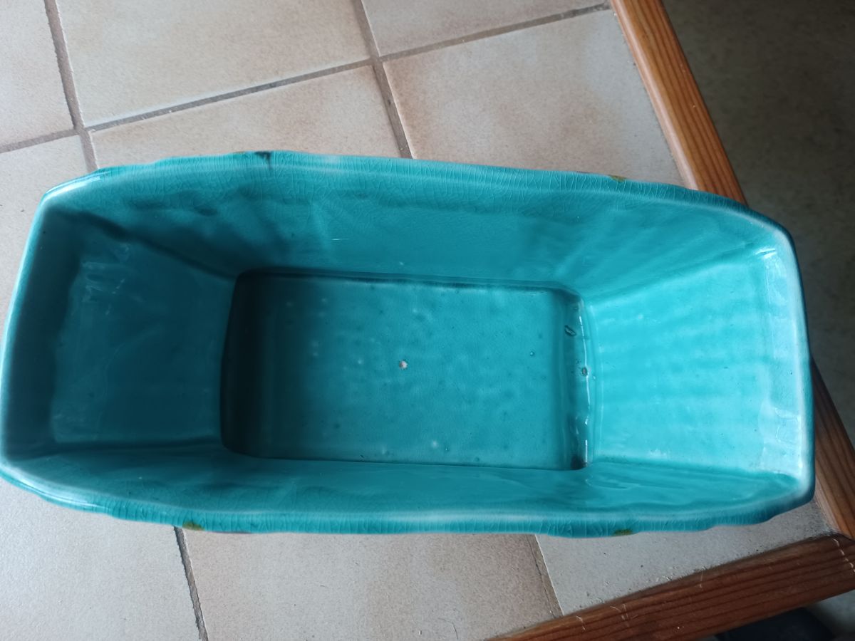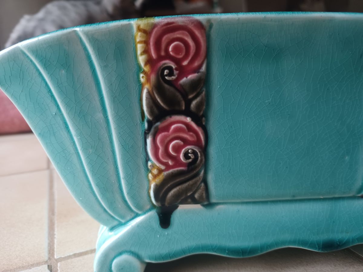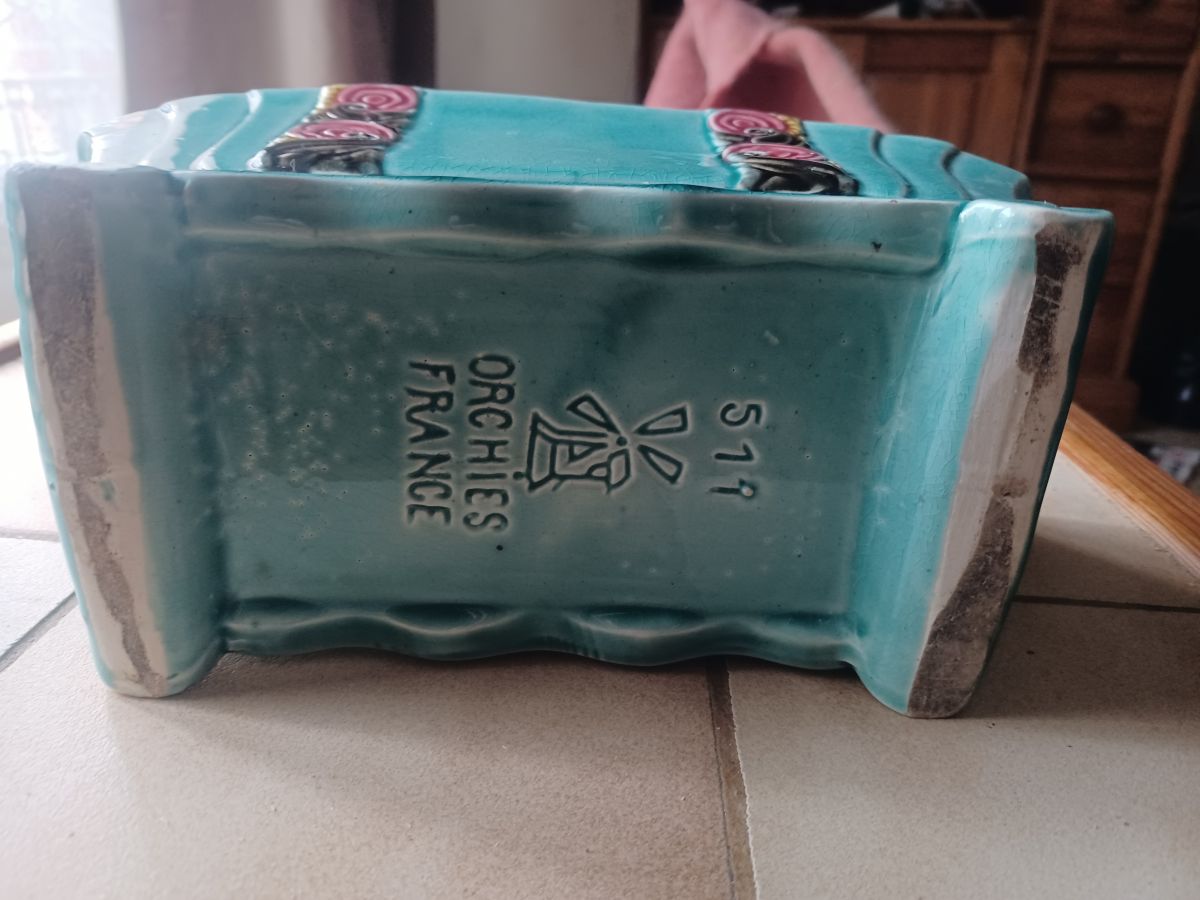 Très jolie et originale jardinière en faïence vert d'eau aux courbes et fleurs stylisées caractéristiques Art Déco, de la faïencerie d'Orchies (Nord de la France).
