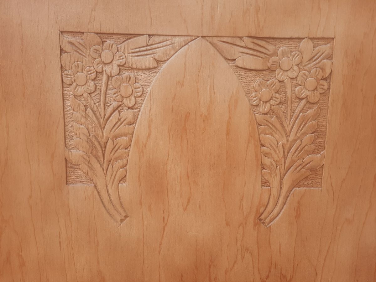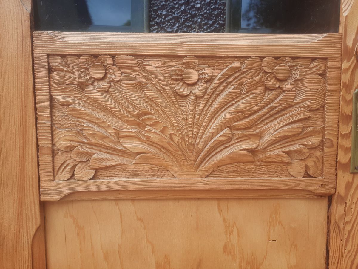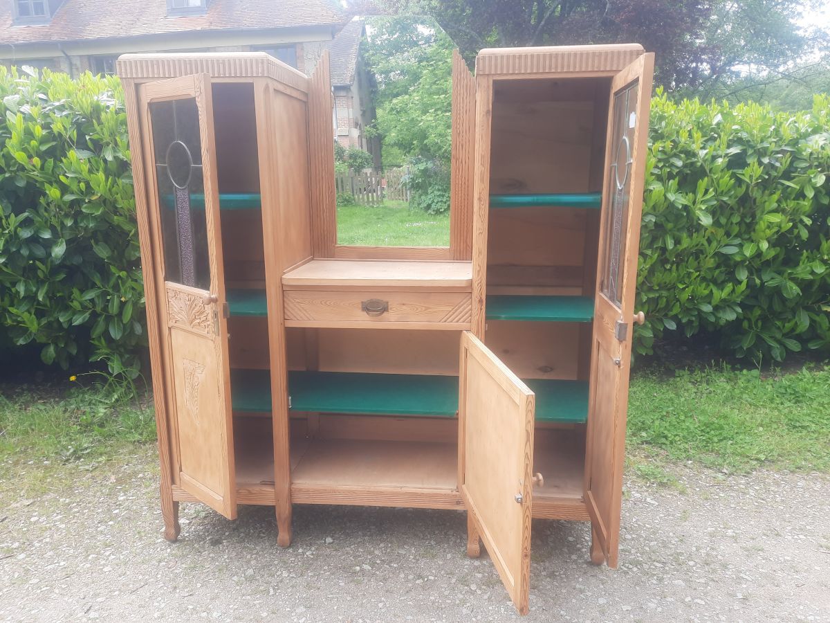 2 éléments de côté: 1 porte à vitrail. Verre biseauté en bon état et verre granité rouge bordeaux fendu à un endroit mais très discret.