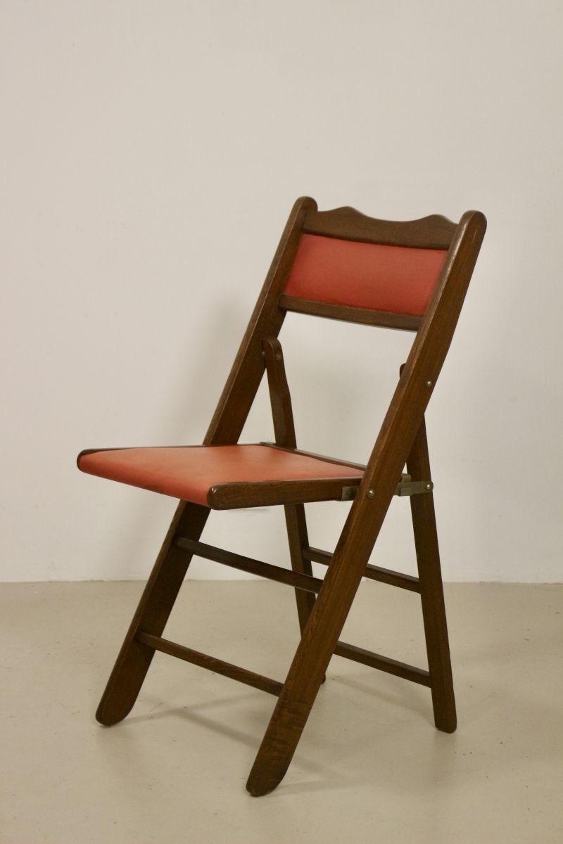 Ces deux chaises pliantes sont en bois et l'assise et le dossier sont recouverts de skaï rouge.