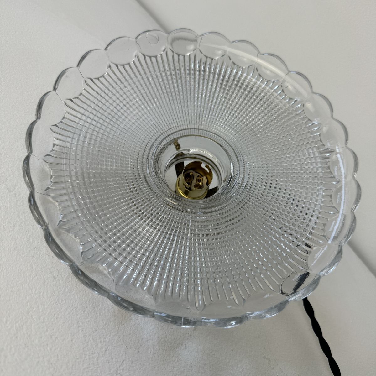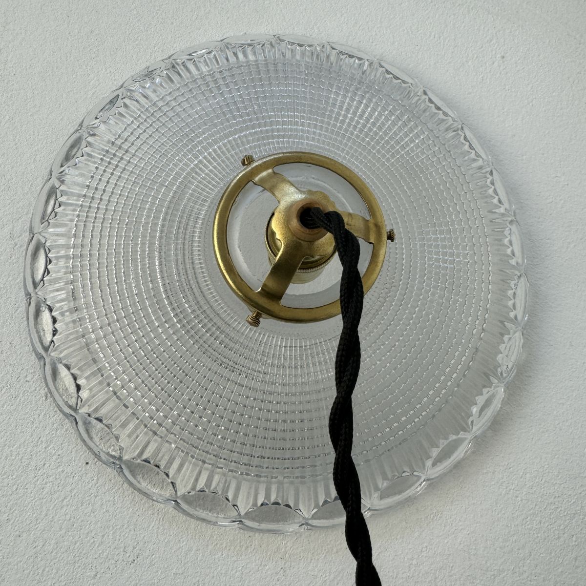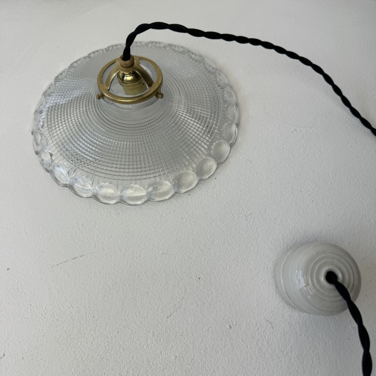 Ancienne suspension en verre prismatique. Rosace de fixation en céramique.