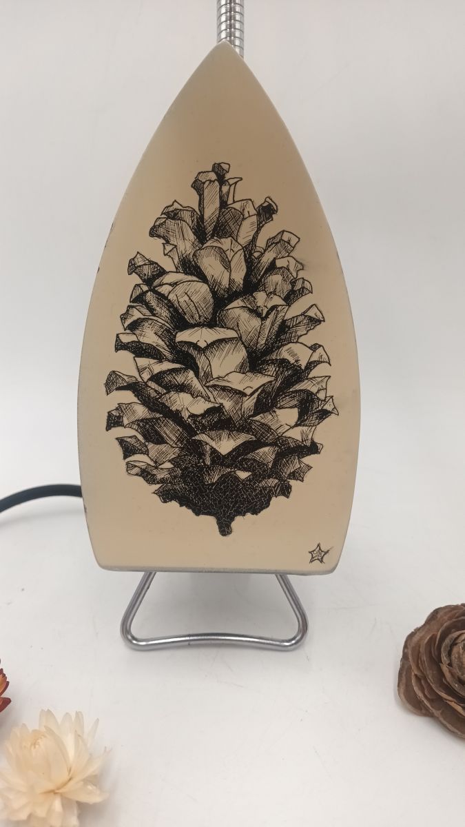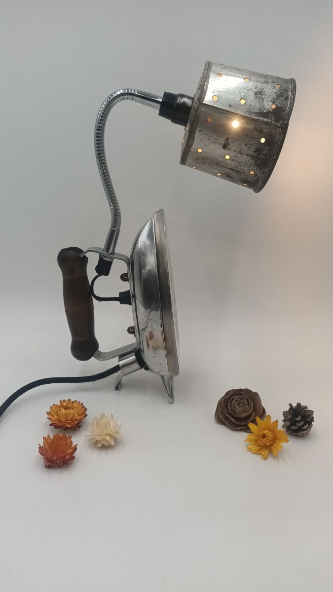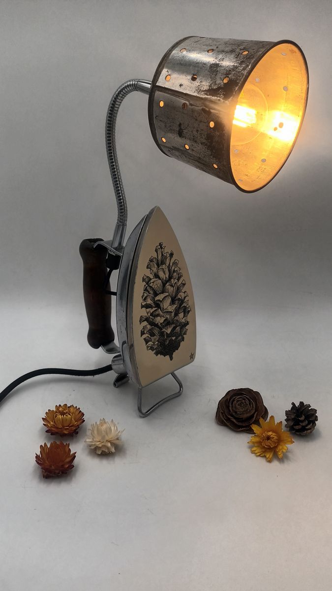 Ancien fer à repasser associé à un pot à faisselle en métal et transformé en lampe. Le motif sur le plat du fer est fait à la main, dessin au feutre puis reverni.