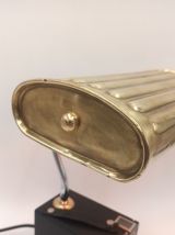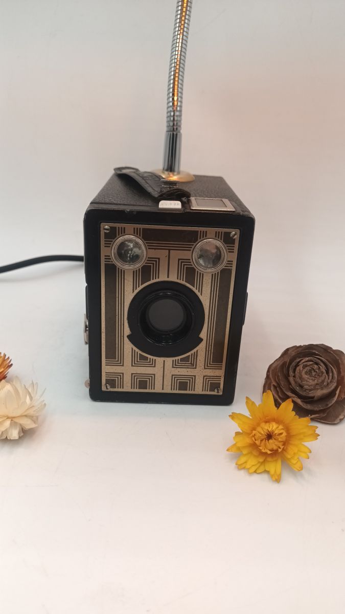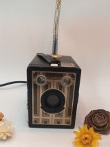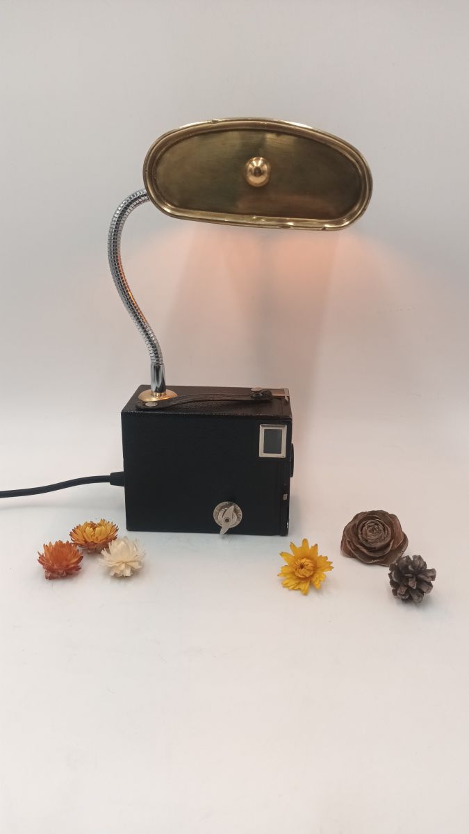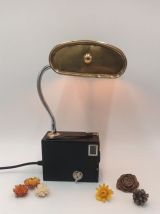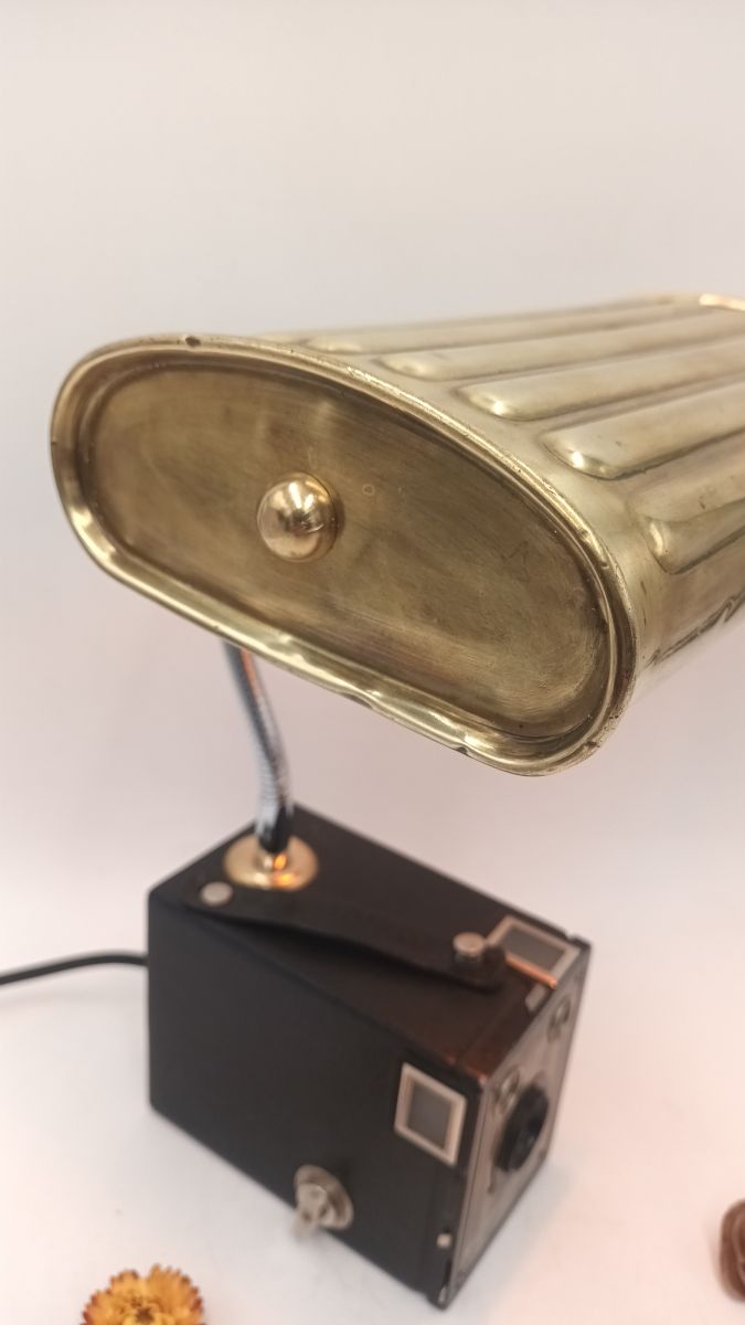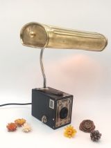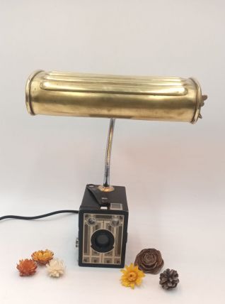 Ancien appareil photo associé à une ancienne bouillotte en laiton et transformé en lampe. Le pied de la lampe est flexible, ce qui permet d'orienter la lumière dans n'importe quelle direction. Parfait pour une lampe de bureau.