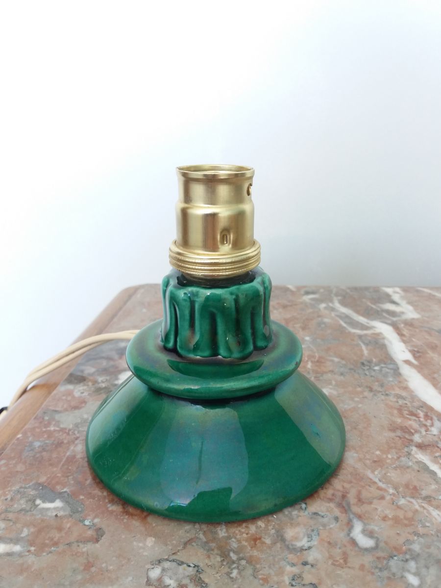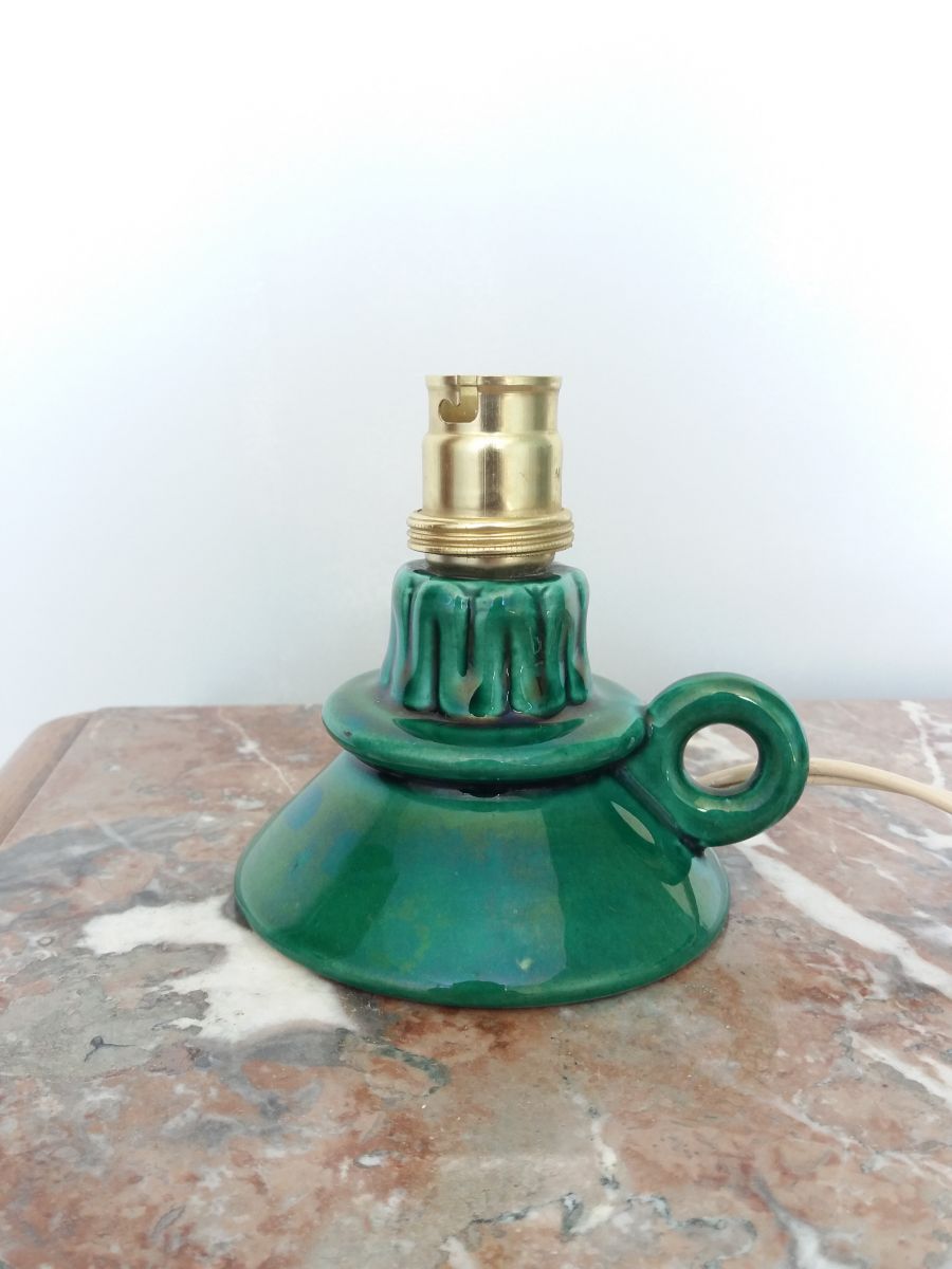 Charmante petite lampe à poser dont le corps, en forme de bougeoir avec anneau de prise en main, est en céramique vert émeraude, avec de très légers reflets irisés (mais moins visibles que sur les photos les plus claires ). Munie d’une jolie ampoule, elle sera du plus bel effet sur une table de chevet. La douille en métal doré étant filetée, on pourra aussi y ajouter un petit abat-jour (il faudra trouver les deux anneaux à visser sur la douille, je vais voir chez moi si j’en trouve et vous tiens au courant ici si c’est le cas). La douille est prévue pour une ampoule à baïonnette, mais on peut envisager de la remplacer par une douille à vis. La céramique n’est pas signée ou estampillée mais ressemble assez à la production de Verceram, Saint-Clément ou Vallauris. Je daterai cette lampe d’entre les années 40 et 60. Elle est en très bel état : la céramique est intacte, la douille ne comporte pas de corrosion, la lampe fonctionne, je l’ai testée. Vu la différence de couleur sur le câble électrique, il me semble qu’un partie n’est pas d’origine (la partie après l’interrupteur jusqu’à la prise électrique incluse). La lampe mesure 7 cm de hauteur au niveau de la céramique et 10 cm de hauteur douille comprise, le diamètre de la céramique est de 9, 5 cm. Le câble électrique est long : 1, 85 m.