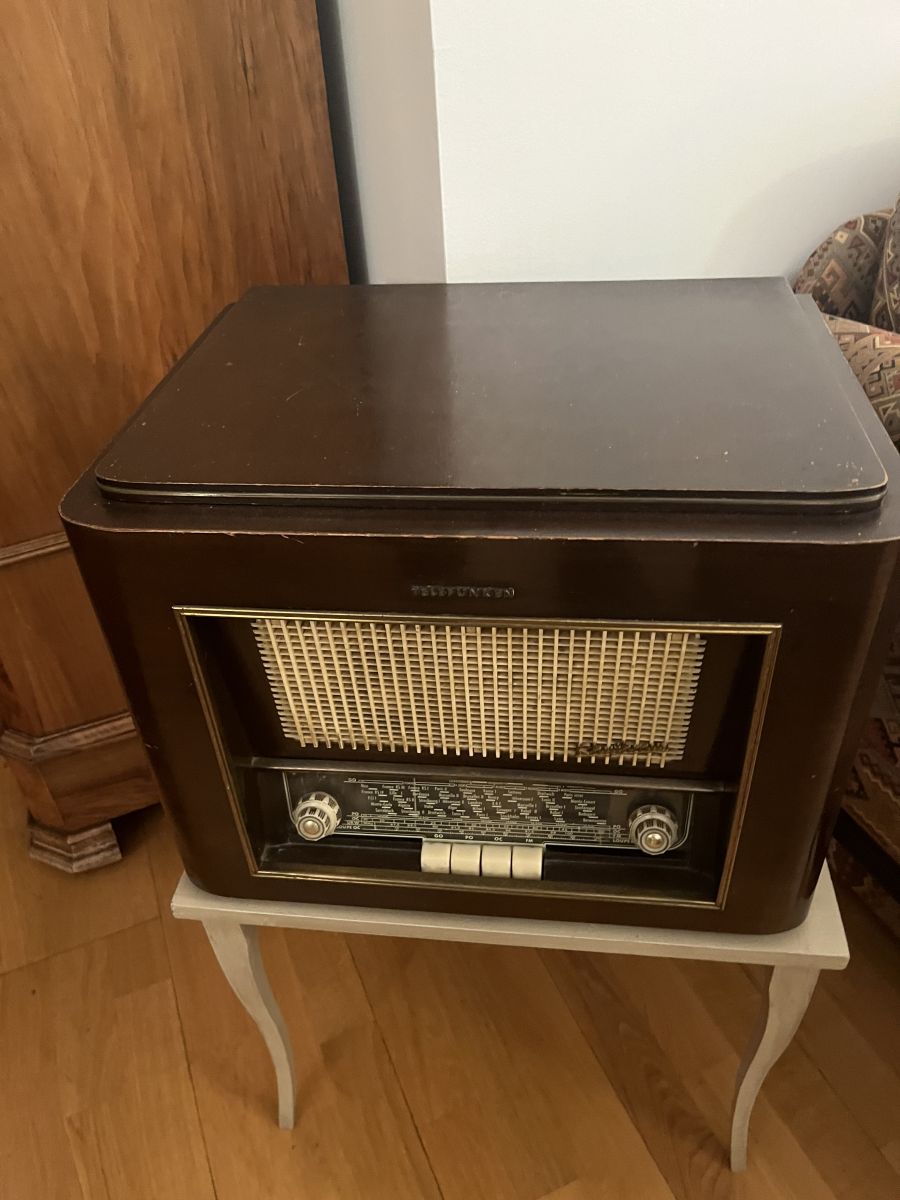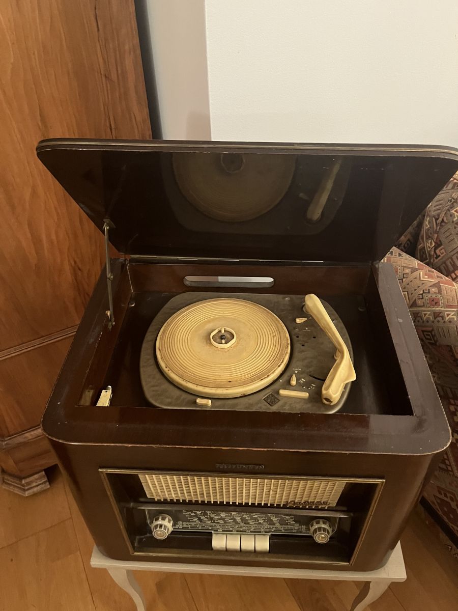Vintage Radio , tourne -disque intégré, absence du cache arrière , les ampoules sont à changer , l’appareil s’allume mais fonctionne pas en l‘état ,