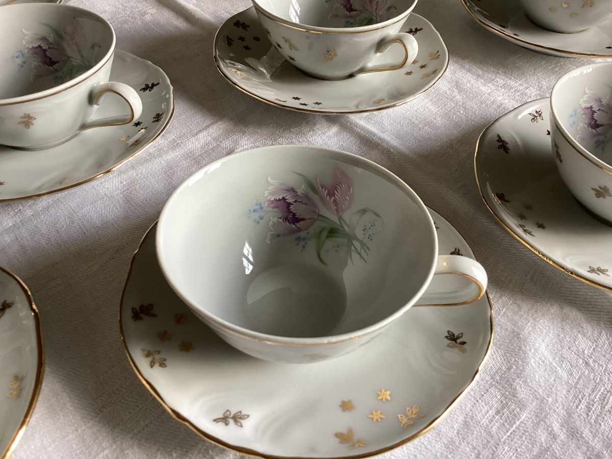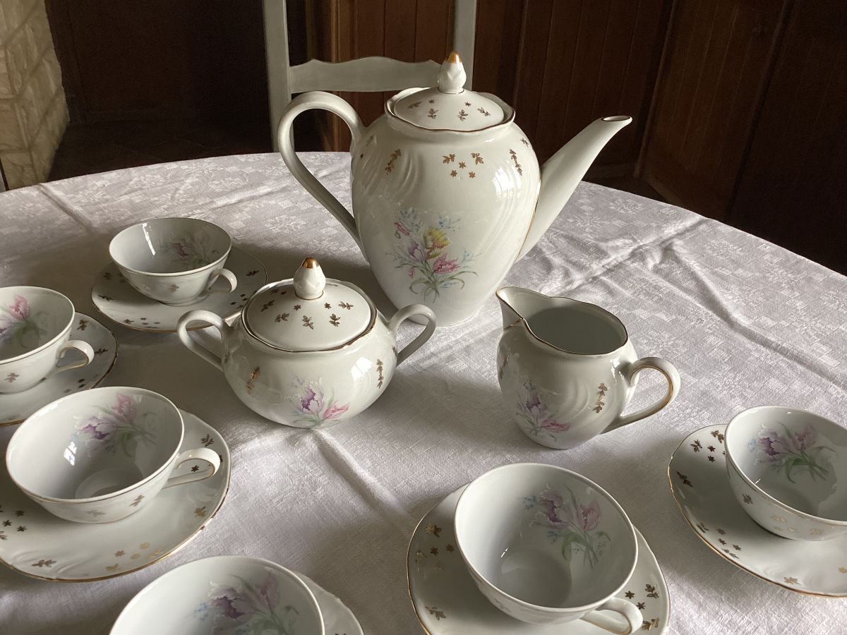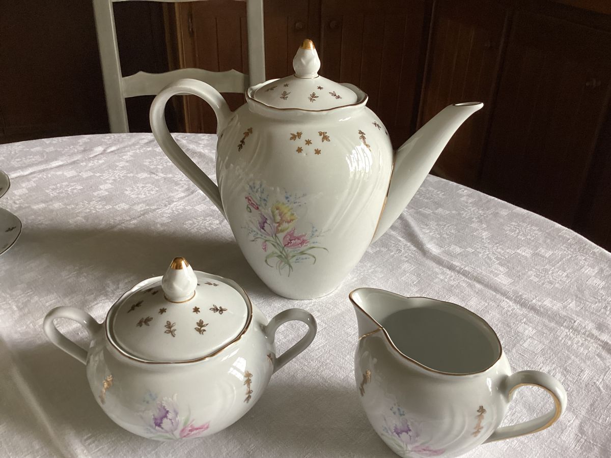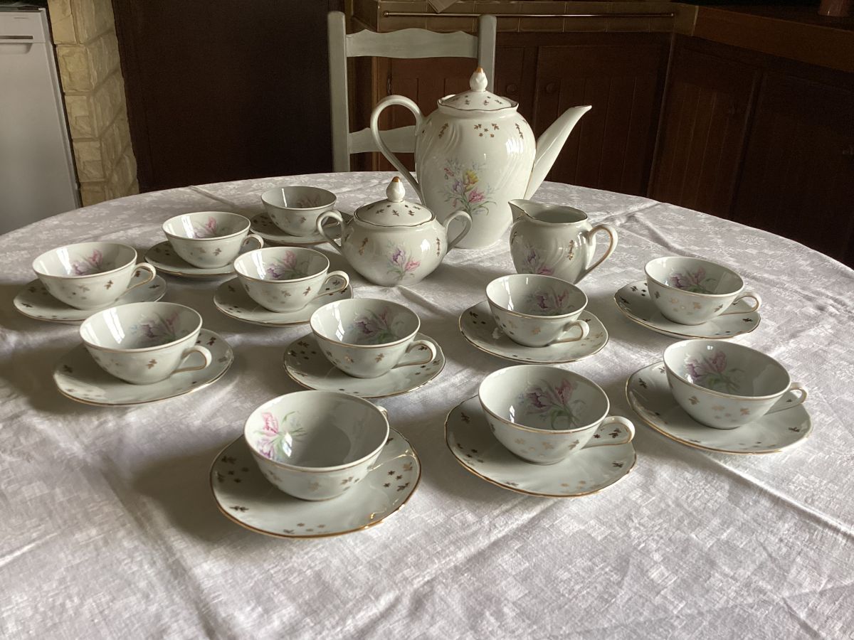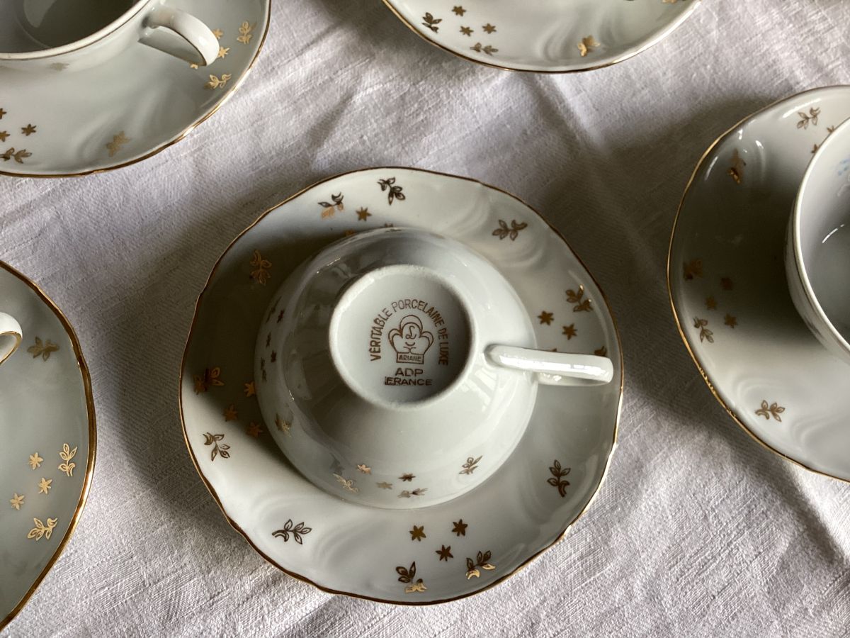 Service à café composé de 11 tasses et sous tasse, une verseuse imprimé et un sucrier porcelaine de Limoges de luxe marque ADP modèle Ariane. Très bon état.