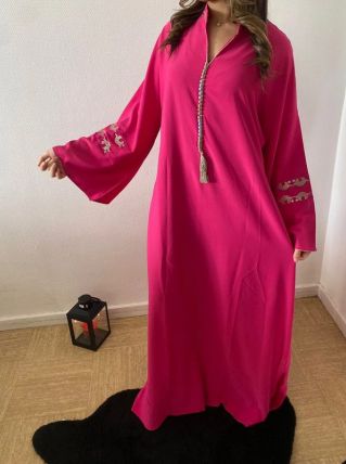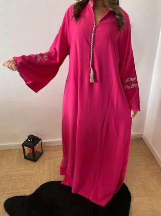 Kendoura marocaine en crépe rosa, col officier brodé /manches brodés/ taille unique ( jusqu’à XXL) / plusieurs couleurs
