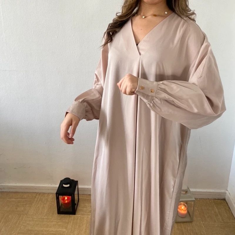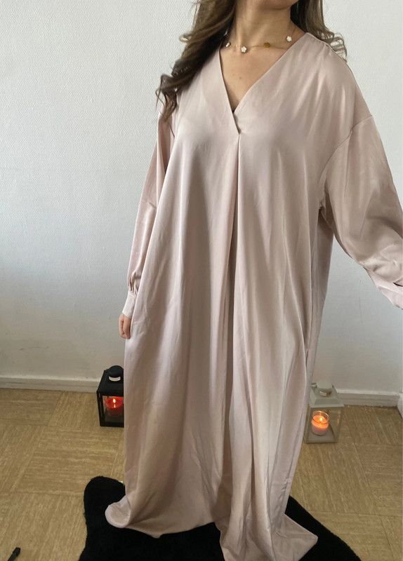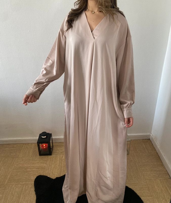 Très belle robe longue satinée/ Cole en v/ Boutons dorés dans les manches / deux poches sur les côtés /longueur : 1,45m