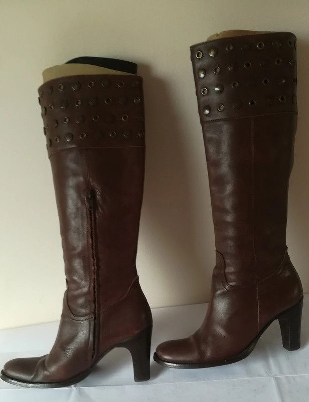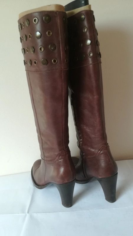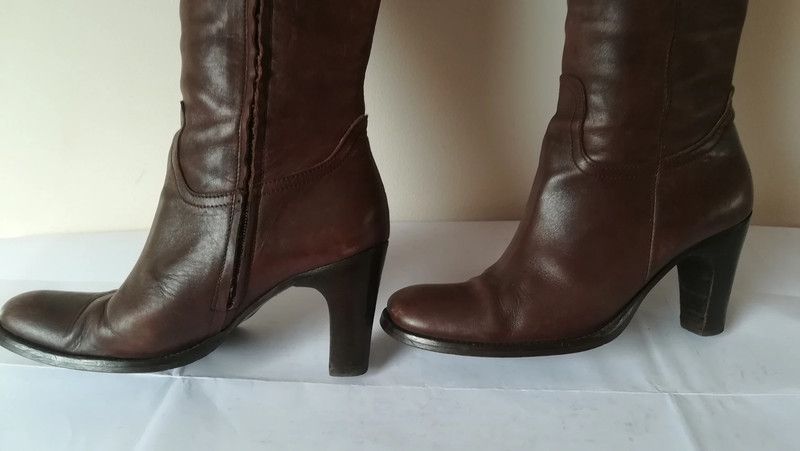 664B* Magnifiques bottes de couleur brune-bordeaux en cuir made in Italy de la marque Giuseppe Alberto. Pointure 36. Hauteur totale de 44 cm. Talons de 8 cm. Largeur mollet (à plat) de 17 cm. Très bonne occasion!