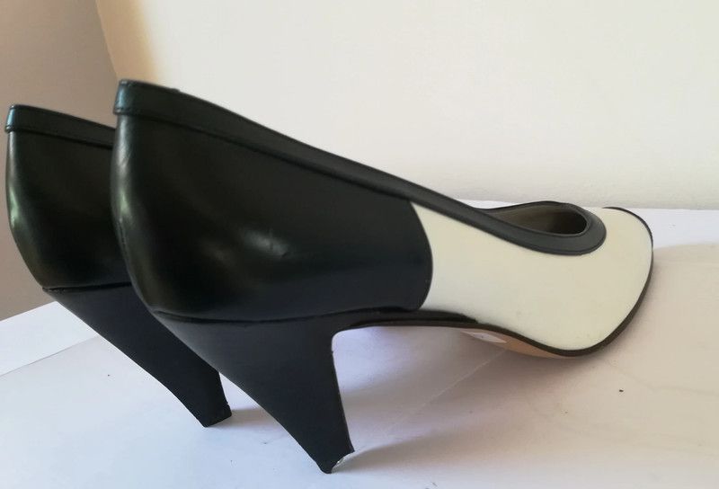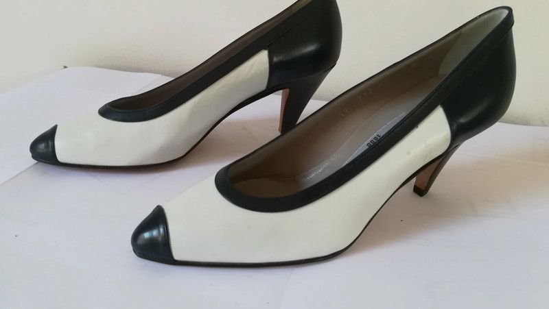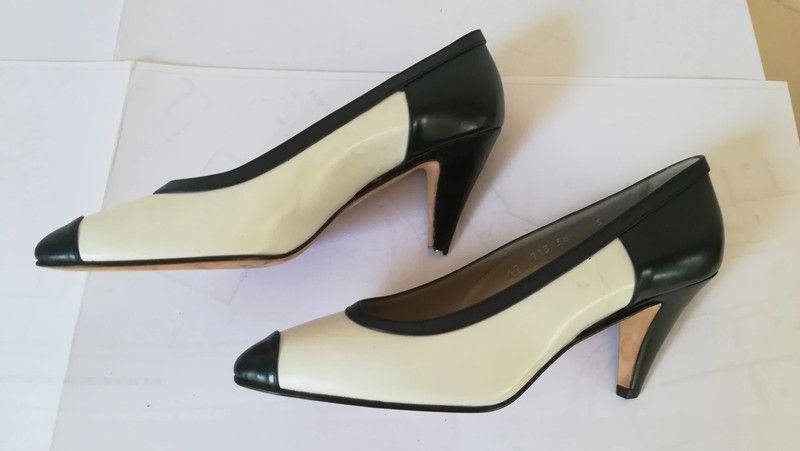 688A* Magnifiques escarpins noirs et blancs VINTAGE de marque PANCALDI, tout en cuir de qualité. Pointure 38. Talons de 7 cm. Super confortables. Entièrement neufs, essayés mais talon à refaire !