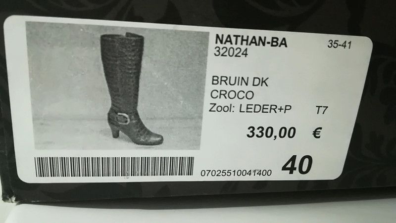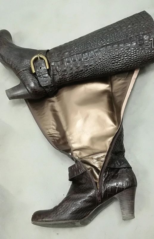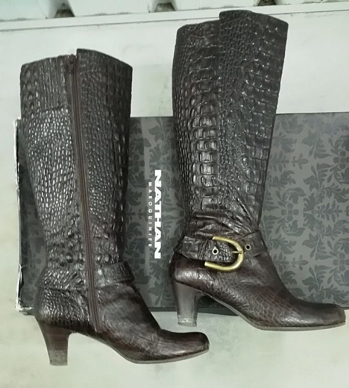 (870) Superbes bottes noires de la célèbre marque de luxe NATHAN. Cuir. Pointure (grand) 40. Hauteur totale de 46 cm. Talons de 6 cm. Portées quelques fois, très bonne occasion. Achetées 330 € ! Sans la boîte (cassée).