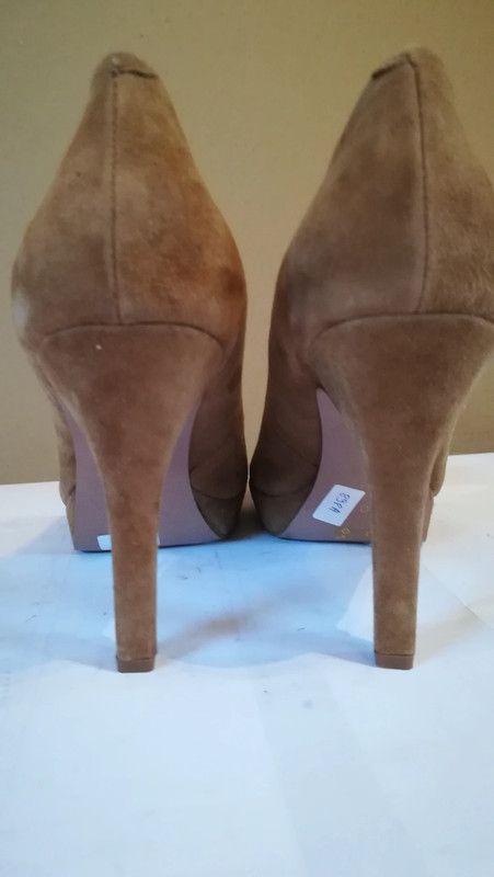 898A* Superbes escarpins kaki de chez CARMA, tout en cuir. Pointure grand 40. Talons de 10 cm avec rehausse de 2 cm. Neufs mais tache présente (voir photos).