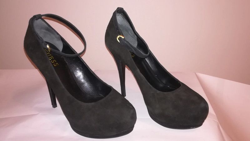 87A* Superbes escarpins noirs à bride de marque GUESS. Cuir. Pointure 39. Talons de 13 cm avec plateau de 4 cm. Portés 2 fois, comme neufs! Prix achat de 180 €.