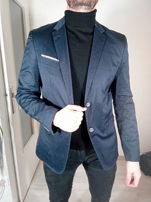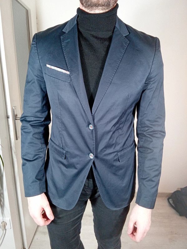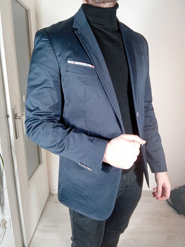 Élégante veste costume marine homme 97% cotton, c'est une taille 54 mais correspondance plutôt à un petit 52/grand 50 ,marque mulish