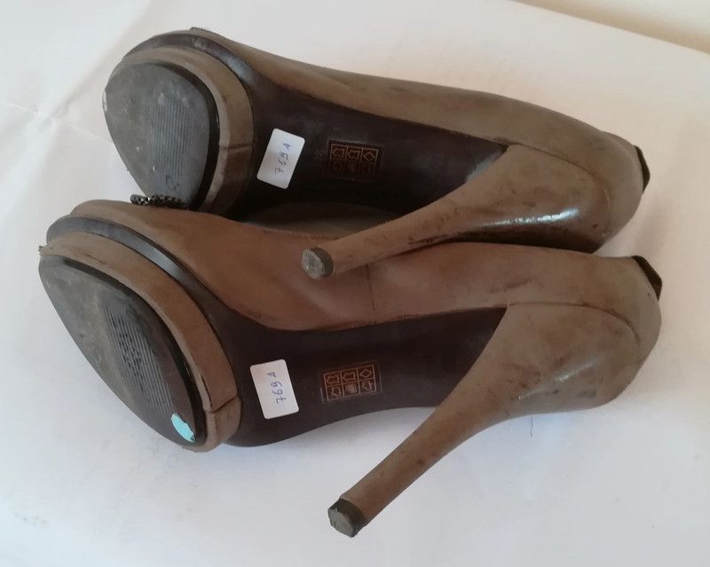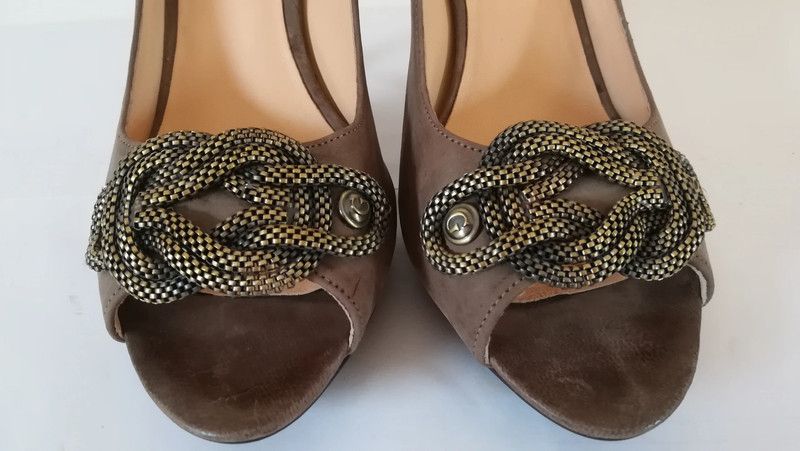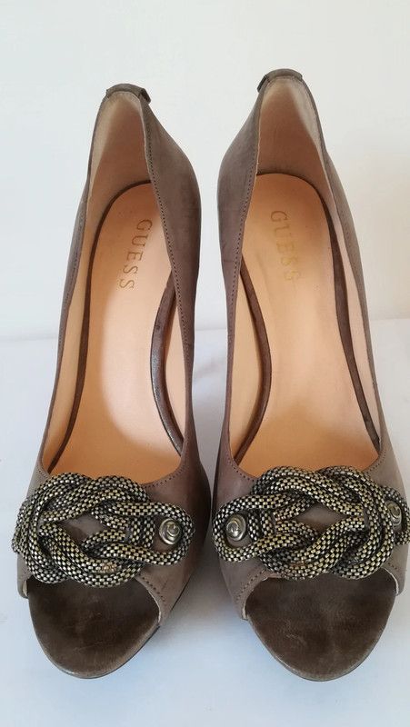 769A* Superbes escarpins peep toe de couleur taupe de marque GUESS. Cuir. Pointure 39 1/2. Talons de 12 cm avec plateau de 2 cm. Portés 2 fois! Prix achat de 190 €.