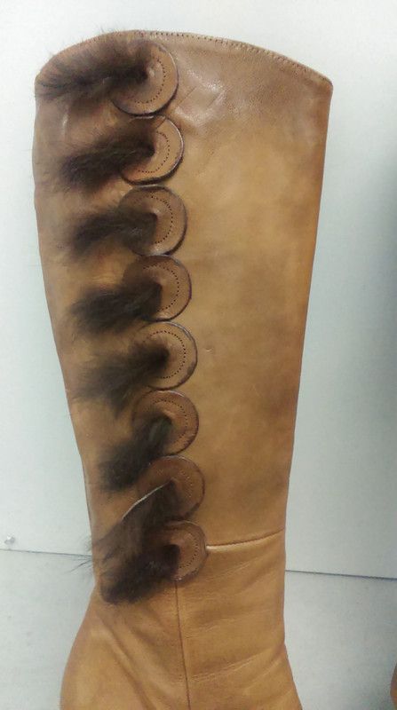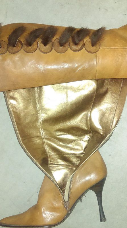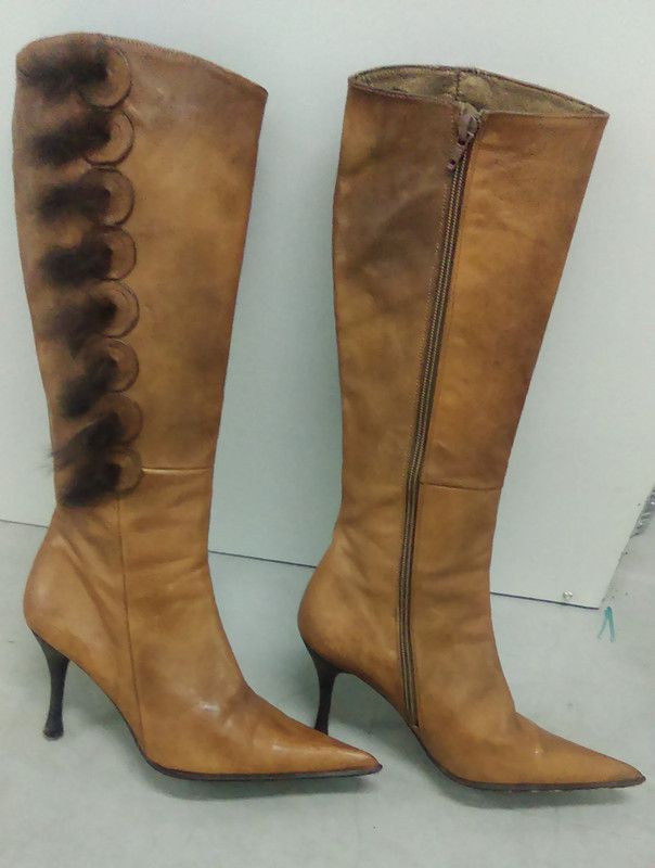 642* Jolies bottes en cuir de la marque EZZIO. Pointure 39. Cuir souple très bonne qualité ! Int+ext+semelles. Hauteur totale de 46 cm. Talons de 9 cm. Largeur mollet de 16,5 cm.