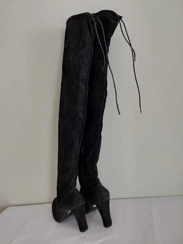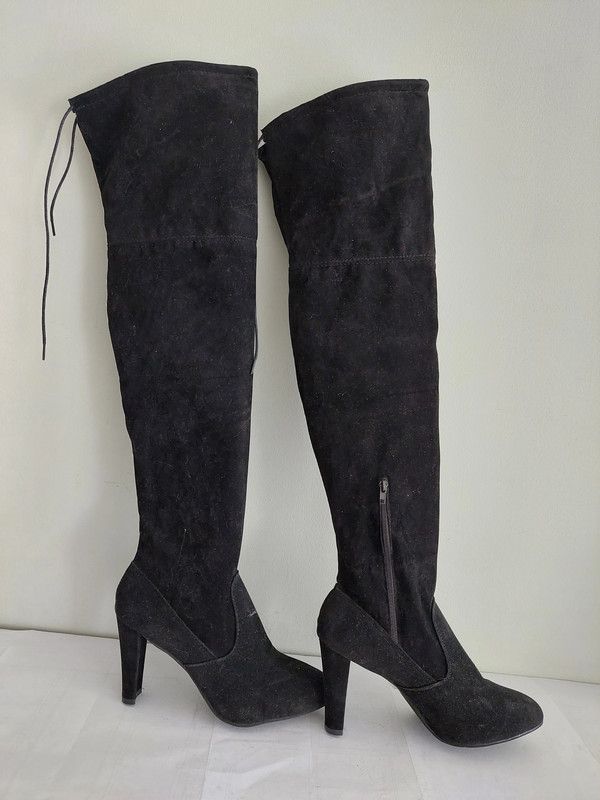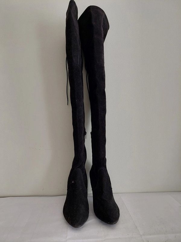 215C* cuissardes noires type velours de marque inconnue. Pointure indiquée 43 mais chausse beaucoup plus petit. Hauteur talon : 10 cm. Hauteur totale de la botte : 63 cm. Neuves !