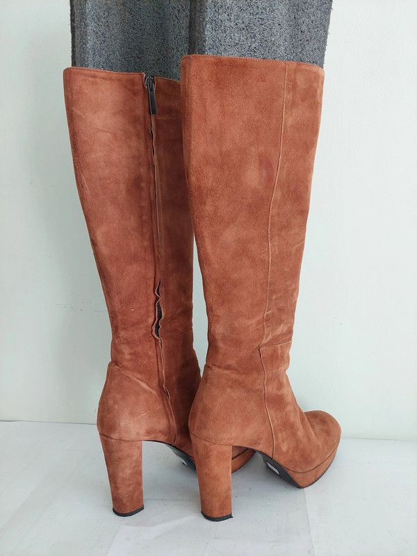 214C* PREZIOSO. Très belle paire de bottes hautes de couleur brune/ocre tout en cuir. Pointure 39,5 - talons de 10 cm avec plateforme de 2 cm. Hauteur totale de 48 cm - largeur du mollet (à plat) de 19 cm. Mises 3 fois. Petit défaut visible. Superbes et sexy!