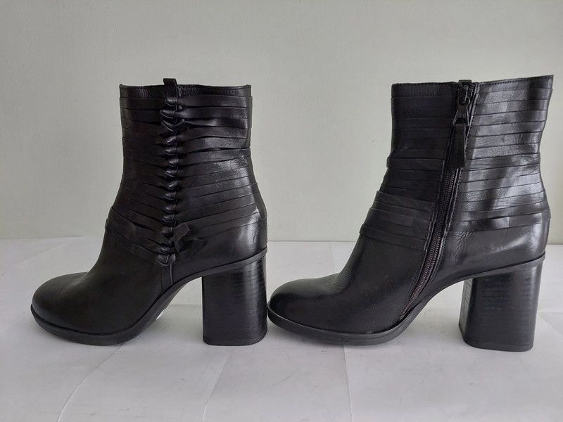191C* Superbes boots noirs en cuir de marque MJUS. Pointure 41. Hauteur totale de 24 cm. Talons de 8 cm avec plateforme de 1 cm. Neufs.