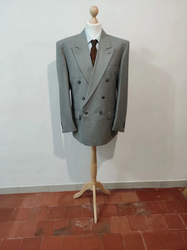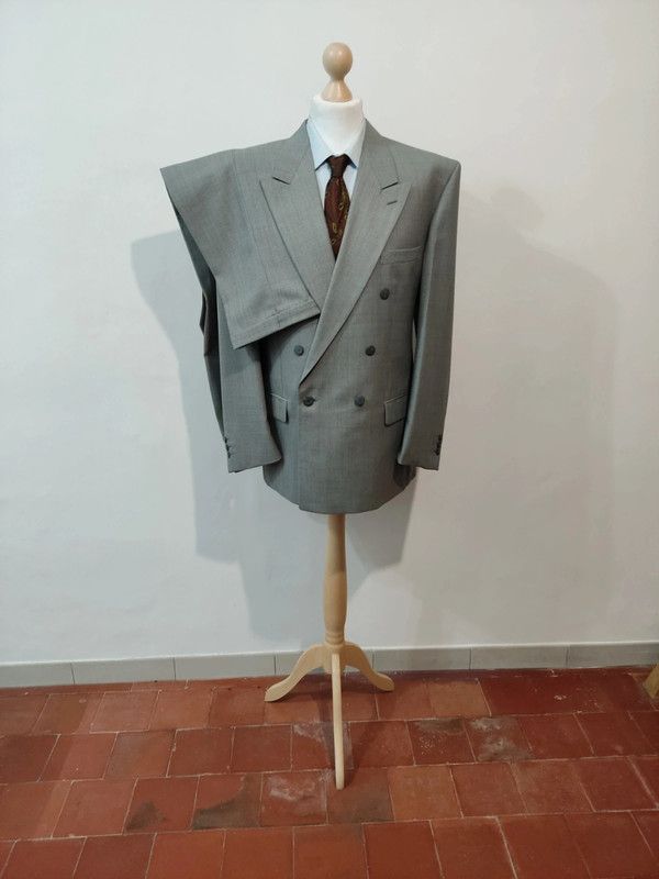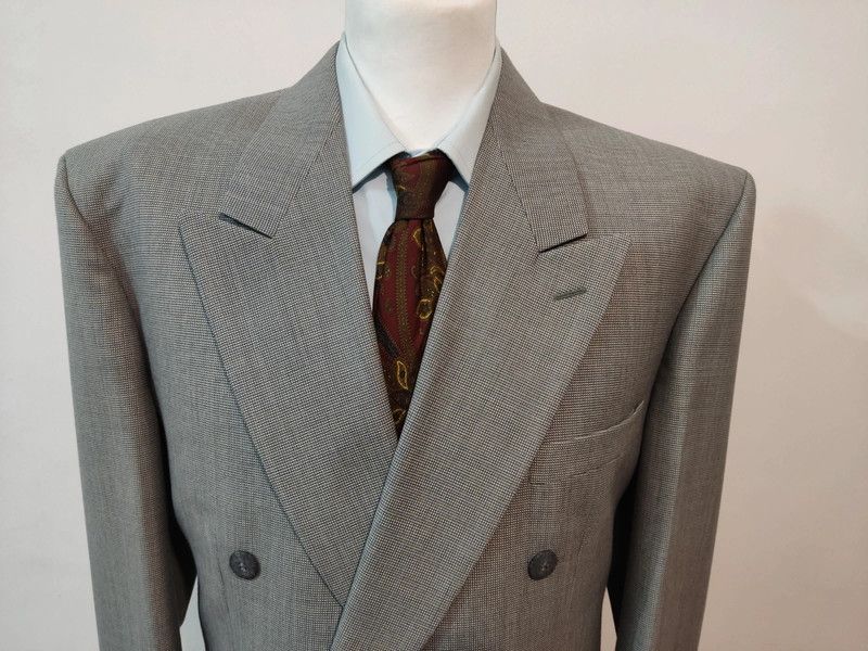 Je vous propose ce prodigieux costume croisé de couleur gris à motif style pied de poule en laine.