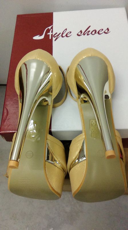 448* Magnifiques sandales de la marque STYLE SHOES. Couleur or, dessus cuir. Pointure 36. Hauts-talons de 14 cm avec plateau de 3 cm. Tout à fait neuves.