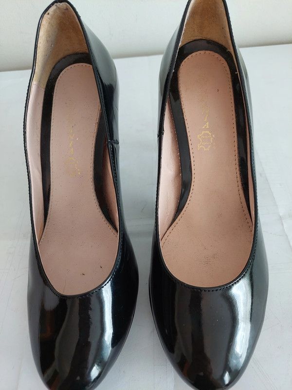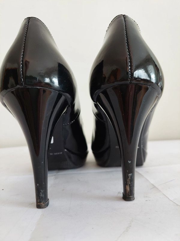 146C* escarpins noirs vinyle de la marque Stefania. Pointure 39. Talons de 9 cm avec rehausse de 2 cm. Portés 2 fois mais quelques coups aux talons et griffés (voir photos).