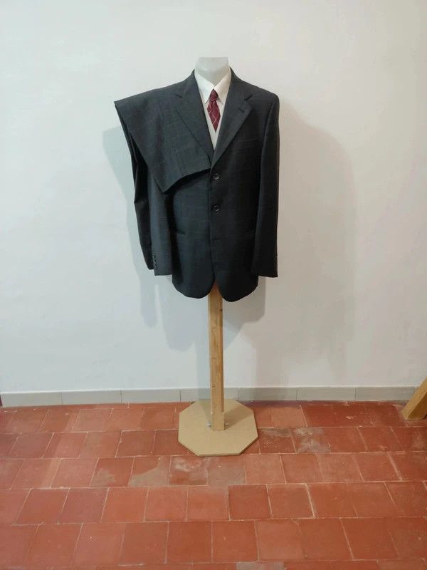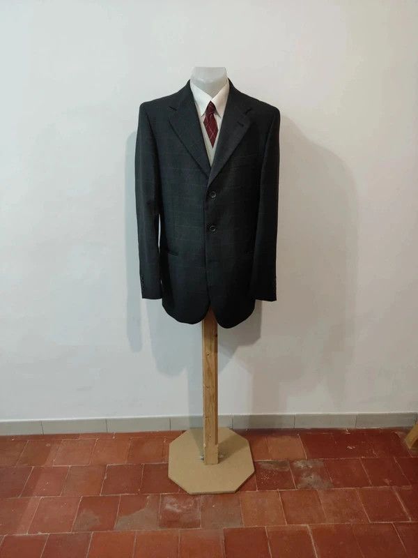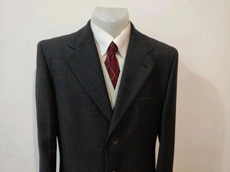 Je vous propose cette original costume de couleur gris anthracite à carreaux orange rouge en laine.