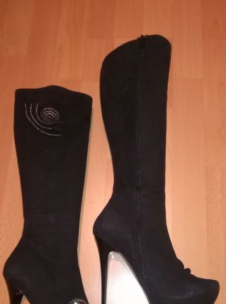 79A* sexy bottes noires en cuir véritable de chez QUASI MODE, avec diamants Swarovski. Pointure 37 - Hauteur totale de 48 cm - largeur mollet (à plat) de 17 cm - talons de 13 cm avec plateau de 3 cm. Entièrement neufs, prix achat 460€