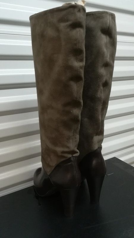 61B* très belle paire de bottes de couleur chocolat - beige en cuir haute qualité de marque ROSELLA LOPES. Pointure 40 - Talons de 9,5 cm - Hauteur totale de 48 cm. Largeur mollet à plat de 18 cm. Neuves !