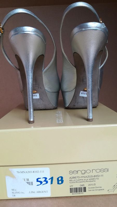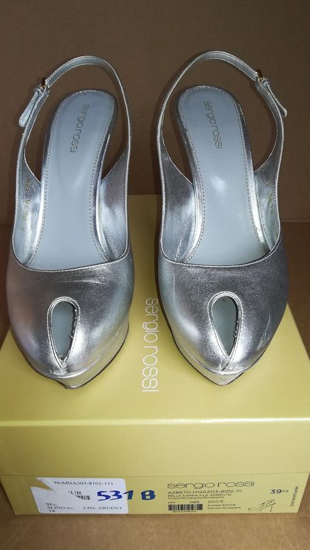 531B* sexy sandales high heels de la marque de luxe Sergio Rossi, made in italy. Tout cuir. Couleur argent. Pointure 39 1/2. Talons de 13 cm, avec rehausse de 3,5 cm. Mis 3 fois, état top.