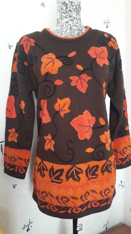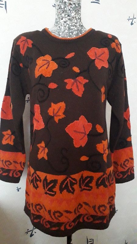 Jamais encore été porté (cadeau trop petit). Feuilles et tiges brodées. Magnifiques couleurs rose, orange, violet, marine sur fond marron. Excellent maintien. Etiquette M mais plutôt L. Hauteur 74cm. Aisselles 51cm. Taille 48cm
