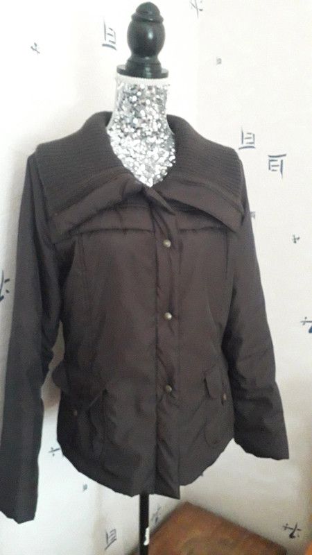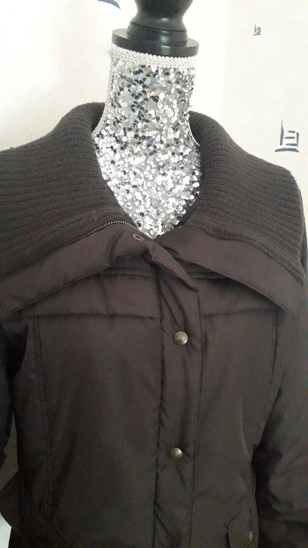 Excellent état. Chic et moderne. Douce, chaude et très confortable. Jolie couleur chocolat. Fermeture éclair + pressions jusqu en haut du col. 2 poches. Aucune griffure ni tache. Hauteur 65cm Aisselles 55cm Taille 49cm
