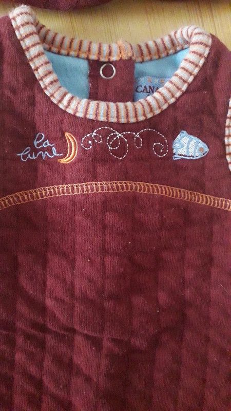 Excellent état car bien entendu très peu porté. Jolie petite robe sans manches avec motif brodé. Gilet manches longues avec motif brodé et fermé par 4