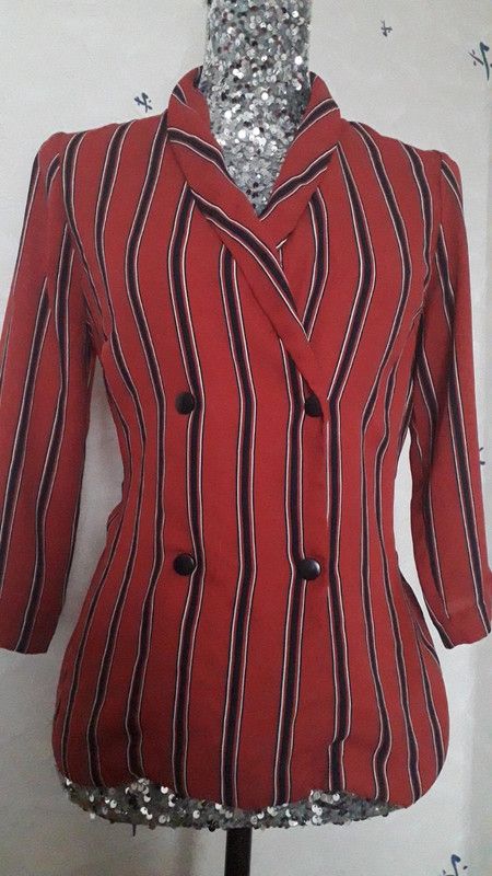 Magnifique blouse-chemisier rouge à bandes noires et blanche