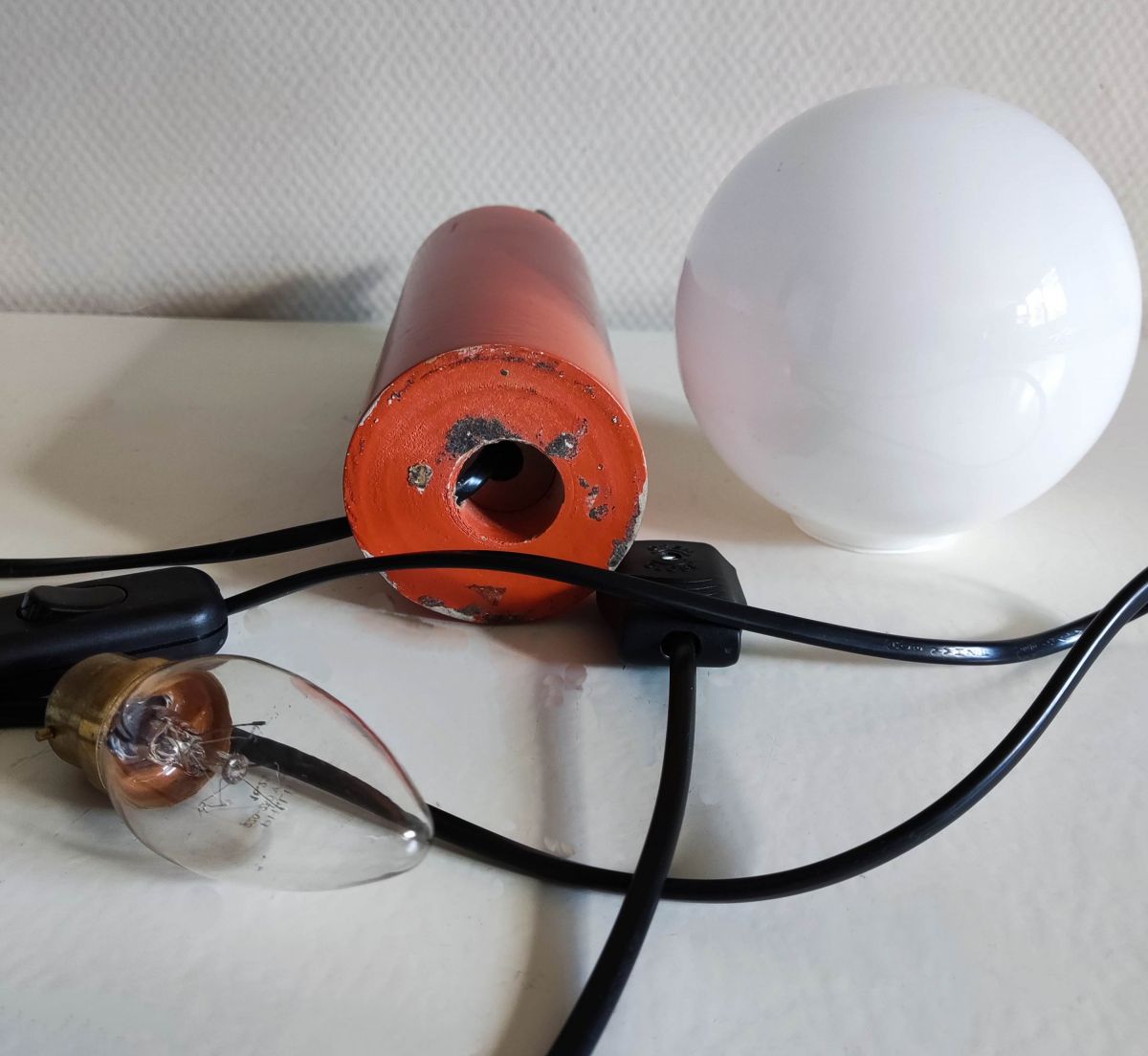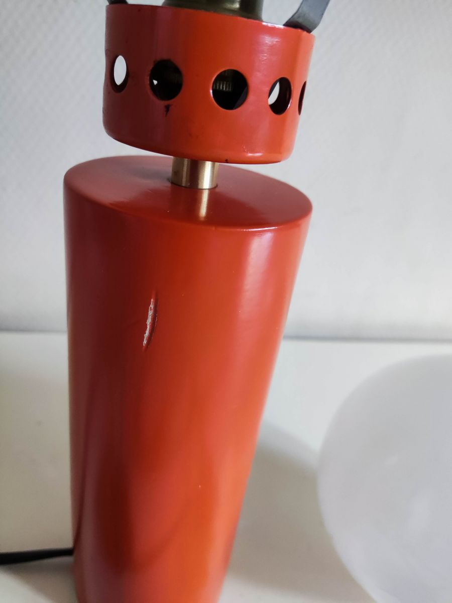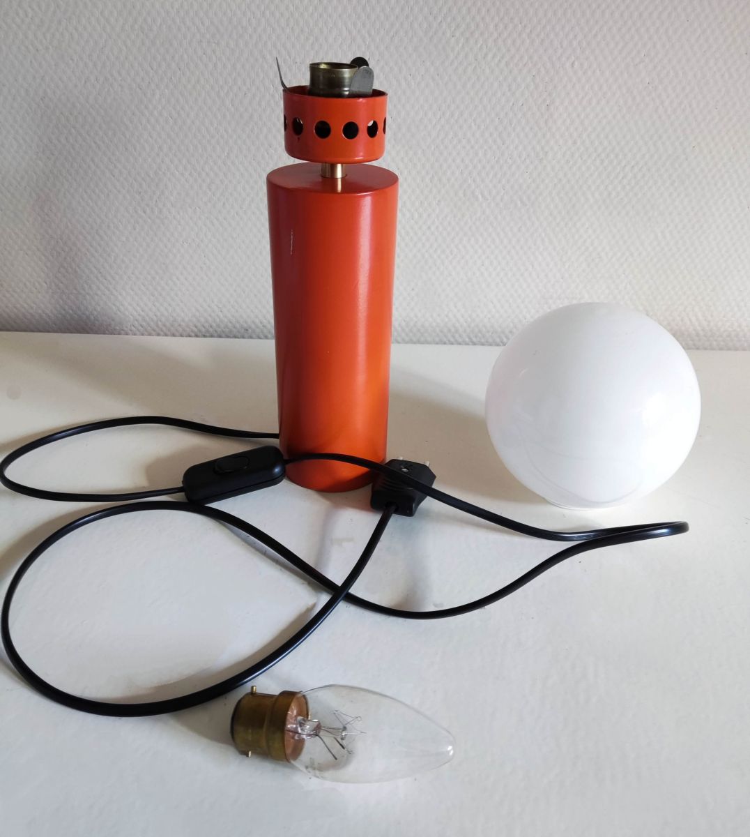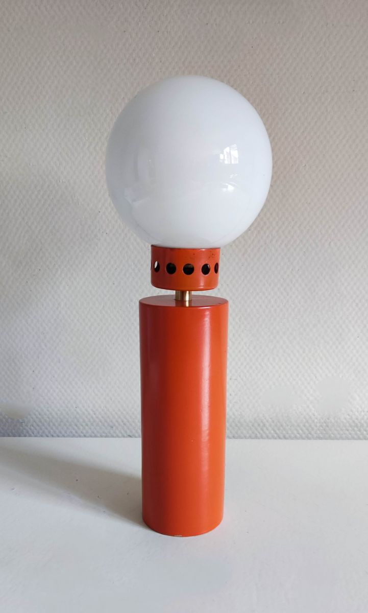lampe vintage en bois et métal orange avec globe blanc opaline