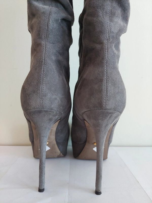 34C* superbes bottes de couleur grise tout en cuir de la grande marque de luxe SERGIO ROSSI. Pointure 37,5. Hauteur totale de 50 cm. Talons de 12 cm avec plateau de 3 cm. Largeutr mollet à plat de 17 cm. Superbe occasion.Très chères à l'achat.