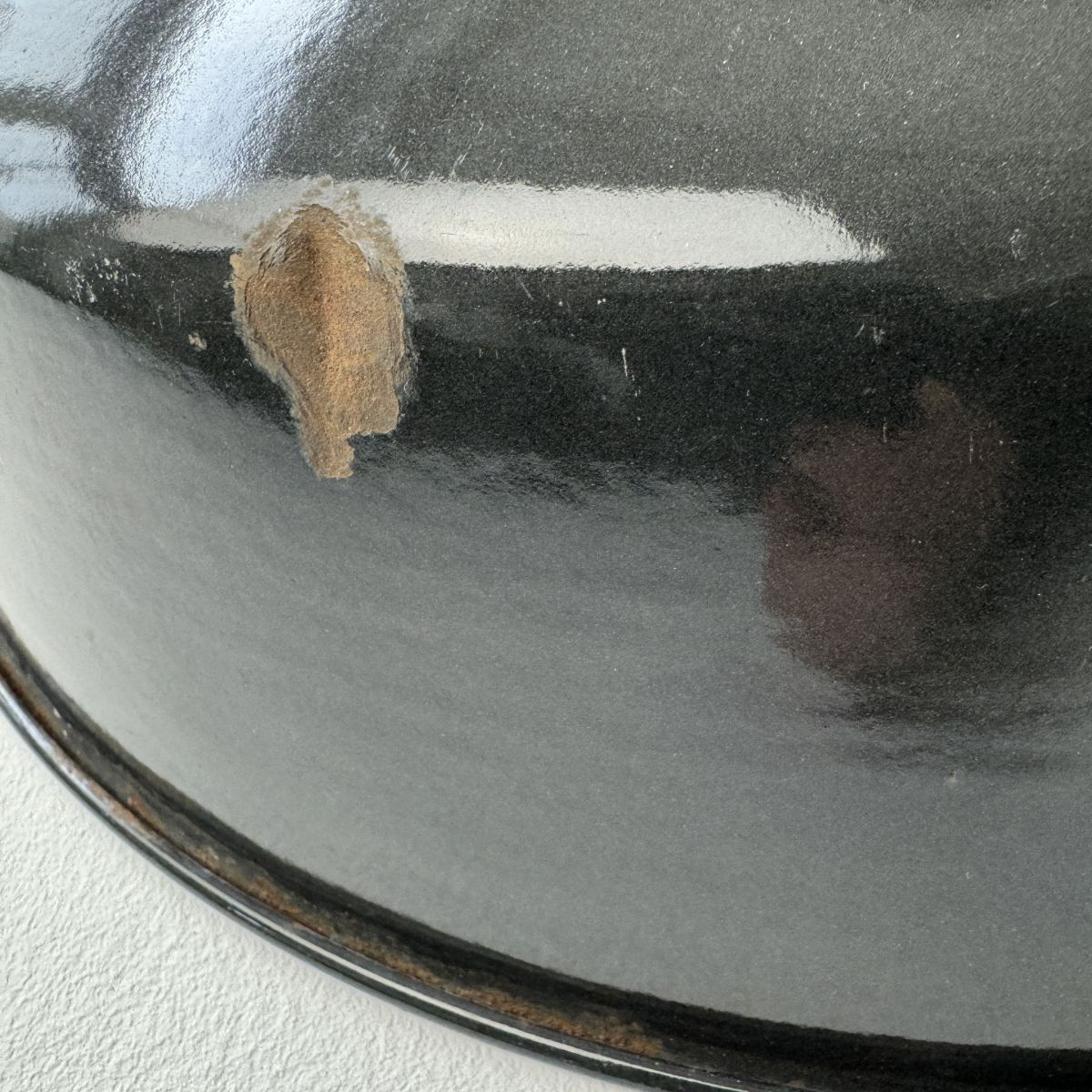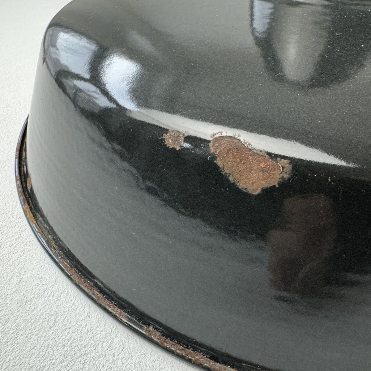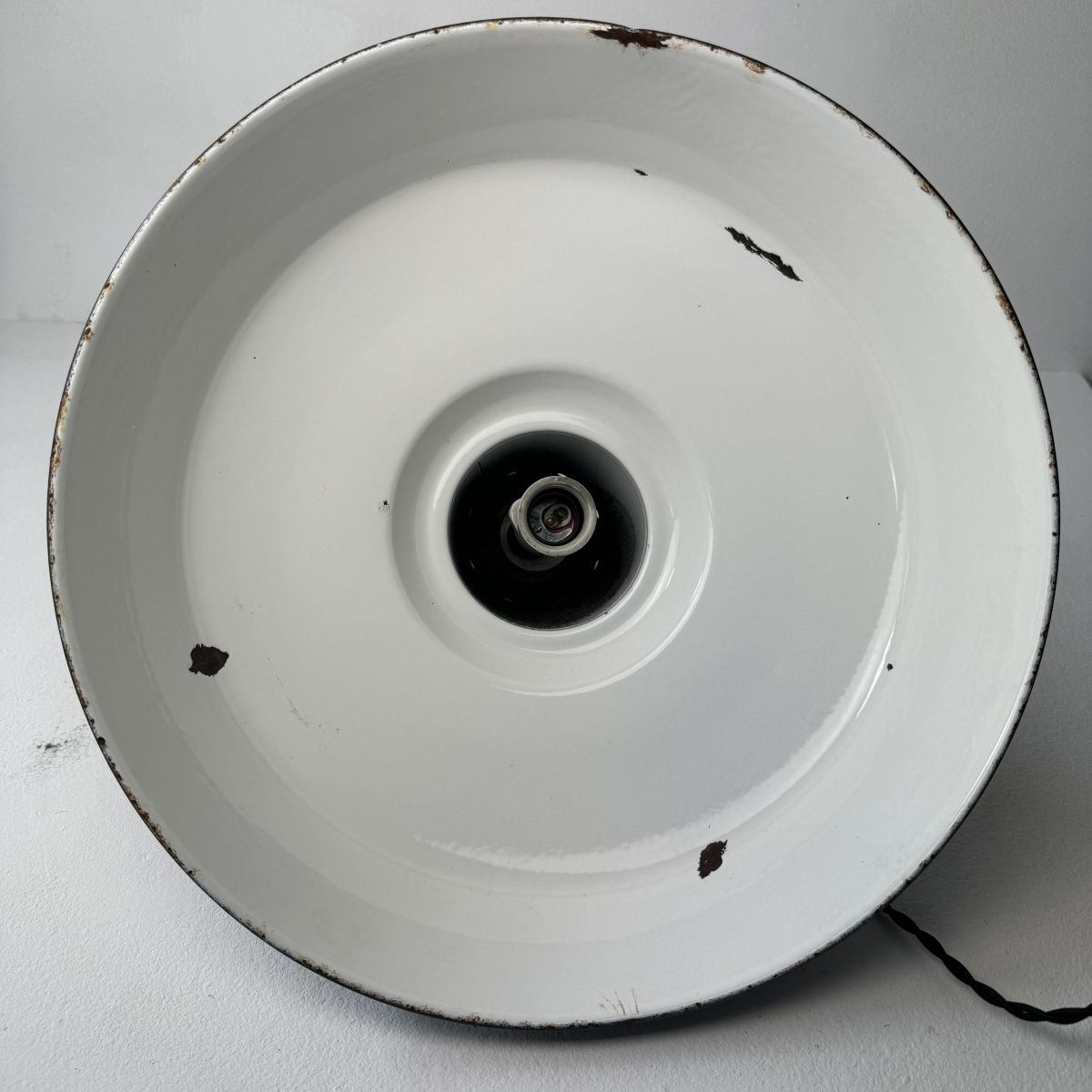 Suspension industrielle en tôle émaillée d’un diamètre de 41 cm. En très bel état général, mais présences de sauts d’email et traces de rouille (voir photos)