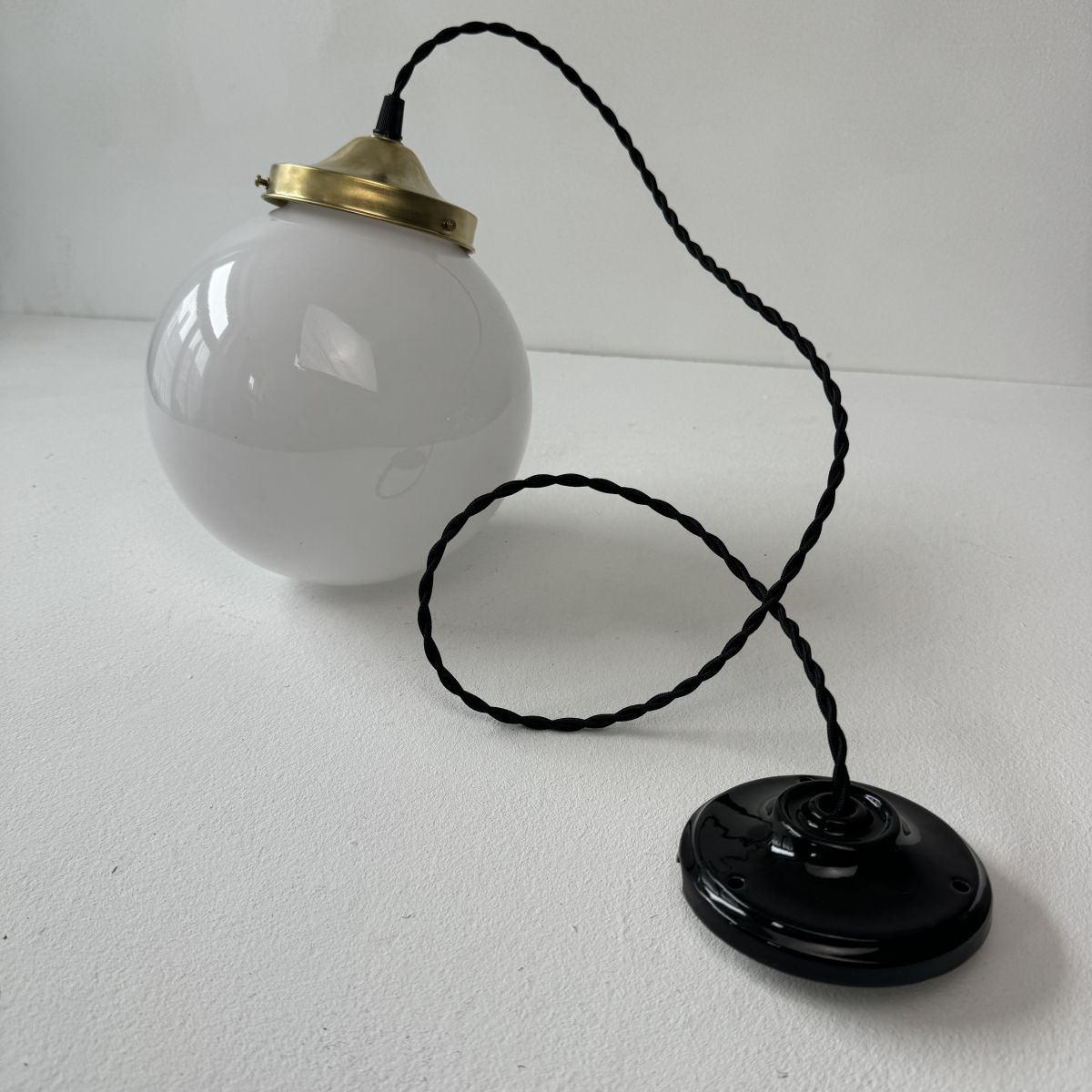 Electricité neuve avec fil noir en tissu torsadé. Prête à brancher par domino. Douille à vis petit culot (ampoule E14) et rosace de fixation en porcelaine.