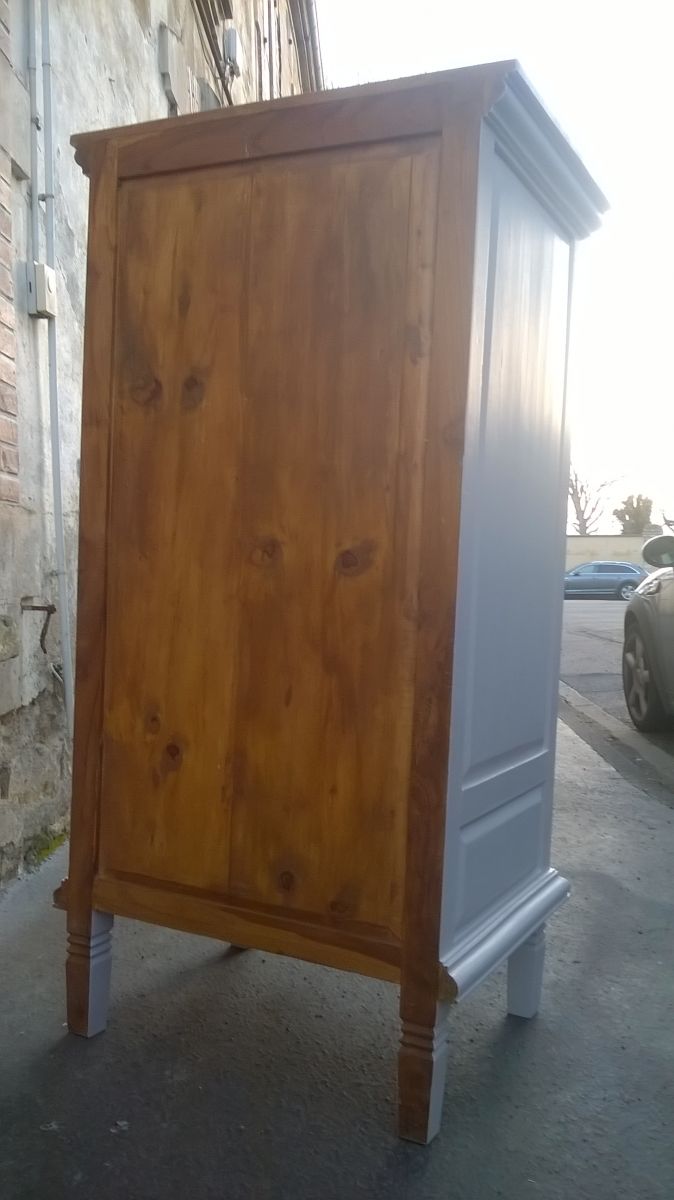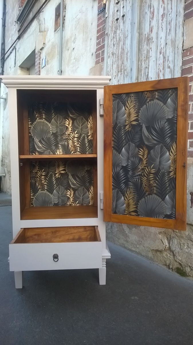 Petite armoire bergère en bois exotique. Fabriqué artisanalement par un menuisier ébéniste. Entièrement poncer et repeint en gris sablé. Aménagée d'un papier noir a motif de feuillage. Hauteur totale 135.5 cm. Largeur 68.5 cm. Profondeur 53 cm. A noté quelques cicatrice, dans l'ensemble belle état de conservation, stable et solide.