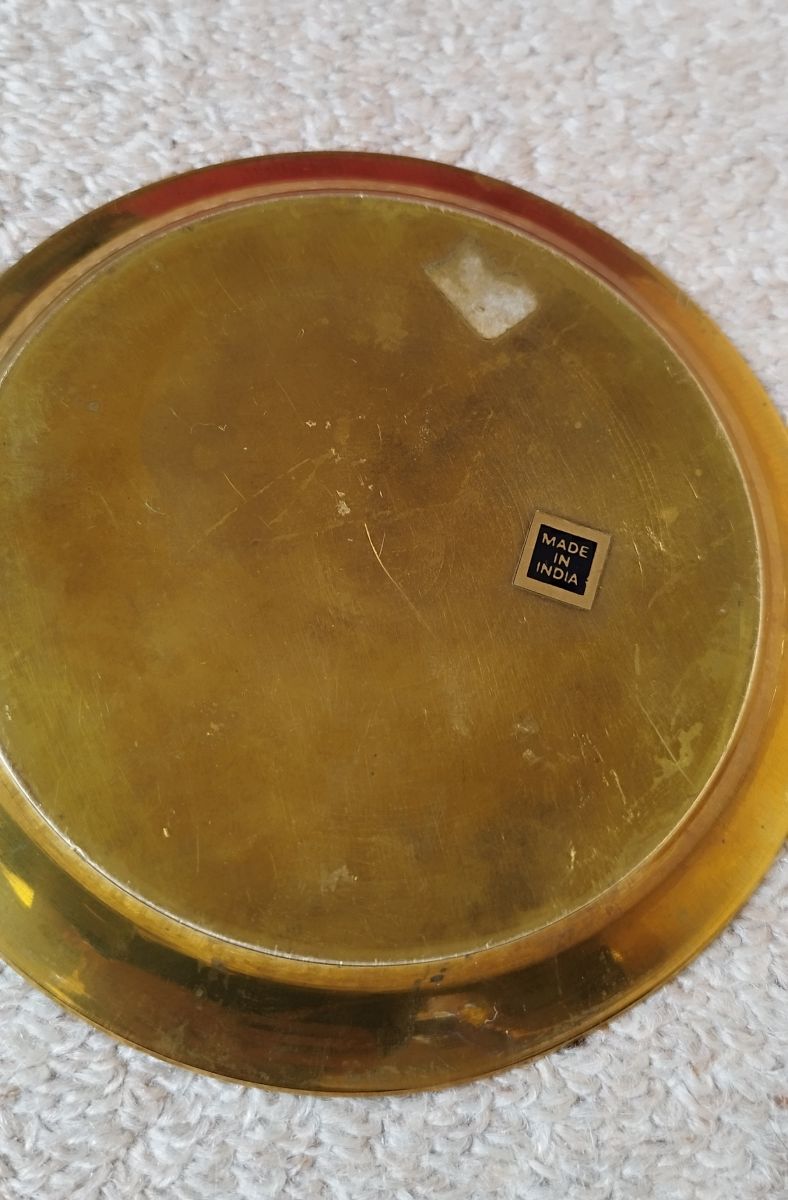Coupelle de présentation avec ses 6 sous verres coupelles en laiton émaillé. Ils sont colorés en vert et représente des fleurs. Made in India.