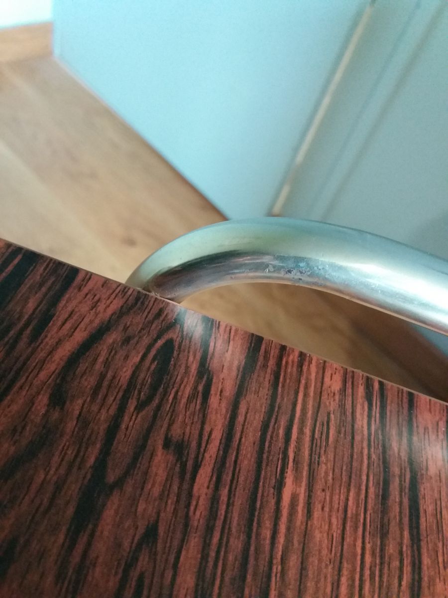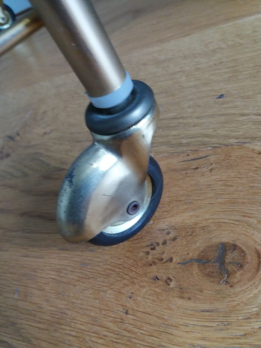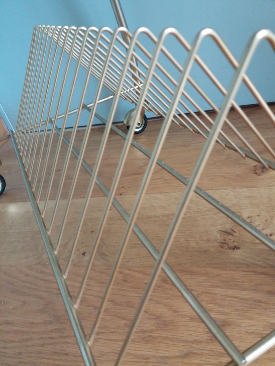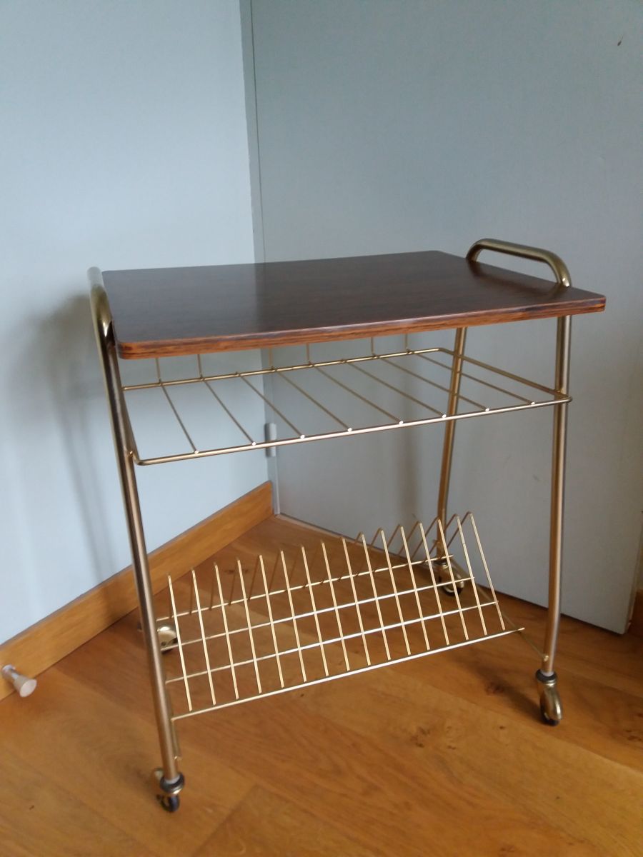 Pratique et tout droit sortie des années 60 ou 70, cette charmante desserte pourra servir à plusieurs usages : à la base meuble hifi avec son espace inférieur où ranger les vinyles, un plateau solide pour y poser tourne-disque ou chaîne hifi et une étagère dessous qui permet de poser quelques magazines ou les disques en cours d’écoute… elle pourra aussi servir de petite table d’appoint ou bout de canapé avec une partie porte-revues. Et pourquoi pas de chevet en l’associant avec l’autre desserte similaire que je propose en boutique (dans un état un peu moins parfait, mais moins chère de ce fait ). La structure est en tubes et tiges de métal doré, le plateau est en formica imitation bois, le tout monté sur 4 roulettes. L’ensemble est en très bel état, bien solide, soudures intactes, roulettes parfaitement fonctionnelles avec « pneus » comme neufs, quasiment pas de corrosion ce qui est assez rare pour être souligné. Les seuls signes de ses 50 ou 60 ans sont : la dorure qui est un peu voilée, un plus pâle qu’à l’origine, de très rares points de corrosion (l’un sur le côté intérieur de l’une des poignées, voir photo), des petits manques de dorure sur les roulettes, et quelques marques très discrètes sur le plateau (on ne les voit que sous un angle bien précis de la lumière). La hauteur mesurée au niveau du plateau est de 60 cm, et 63 cm au niveau des poignées. L’encombrement maximal mesuré au niveau des roulettes est un rectangle de 54 cm par 34 cm, le plateau mesure 50 cm par 40 cm pour une épaisseur de 1, 5 cm.